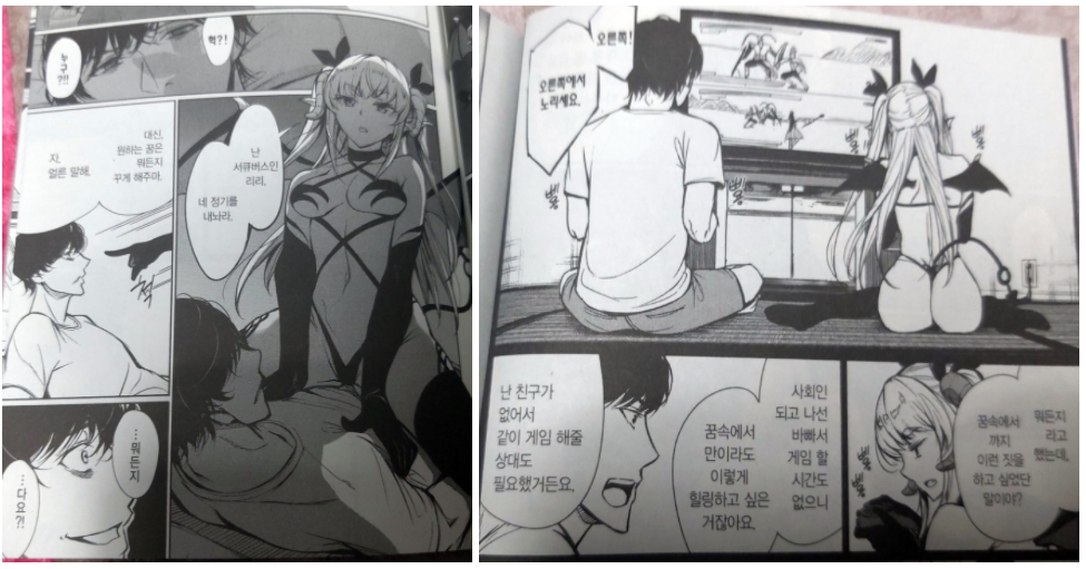흔히들 서큐버스라고 하면 남자를 유혹하고 정기를 빨아먹는 상상속의 존재로 표현됩니다. 이 책에서도 그런 이야기로 흘러가는 듯 했지만 애석하게도 남자주인공은 그런 서큐버스의 유혹에 끄떡도 하지 않았죠. 오히려 원하는 걸 꿈속에서 이뤄준다고 하니, 푹 쉬고 싶다거나 드럼통 안에서 목욕하고 싶다 등 너무나도 소박한 소원을 빌면서 약간 부처님 마인드가 보이는 듯 하였죠. (근데 저도 살짝 비슷한 생각이라...그냥 소소한게 좋아요..!)