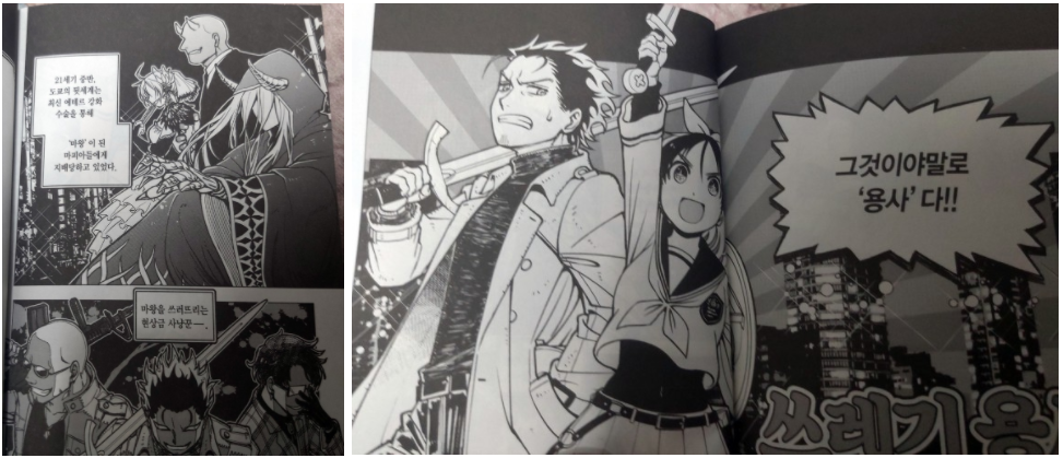 이 만화의 장르는 독특하게도 현대입니다. 마왕과 용사가 등장하는 작품은 많지만 그 배경을 현대로 하는 장르는 그렇게 많지 않은데요. 소재의 단어선정은 중세 판타지 느낌인데 반해 인물들의 복장이나 전투방식은 현대와 미래를 왔다갔다하는 느낌이라 이 둘 사이에서 오는 차이로 인한 신선함과 이를 잘 섞이게 해서 양쪽의 장점을 모두 살린듯한 재미가 무척 좋았습니다.