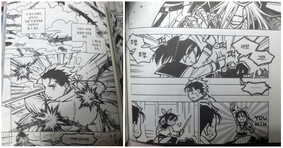 사실 스토리 큰 틀은 약간 뻔한 느낌이기도 합니다. 용사라는 이름을 달지 않고 살인자라고 불리면서 그저 되는대로 사는 주인공이지만 용사를 꿈꾸는 여고생들을 도와주고, 다시금 용사가 되어 마왕을 무찌르는 형태의 이야기는 이미 다른 작품을 통해서도 익숙하게 보이는 서사구조이기도 합니다. 하지만 이를 다소 억지스러운 전개가 아니라 자연스럽게, 물흐르듯 이어가고 있어 큰 거부감 없이 자연스레 몰입할수 있게 만들었고, 중간중간 보여주는 긴박한 액션신과 장면들의 연속으로 계속 쾌감을 불러일으켜서 끝까지 정말 재밌게 읽을 수 있었다고 생각합니다.