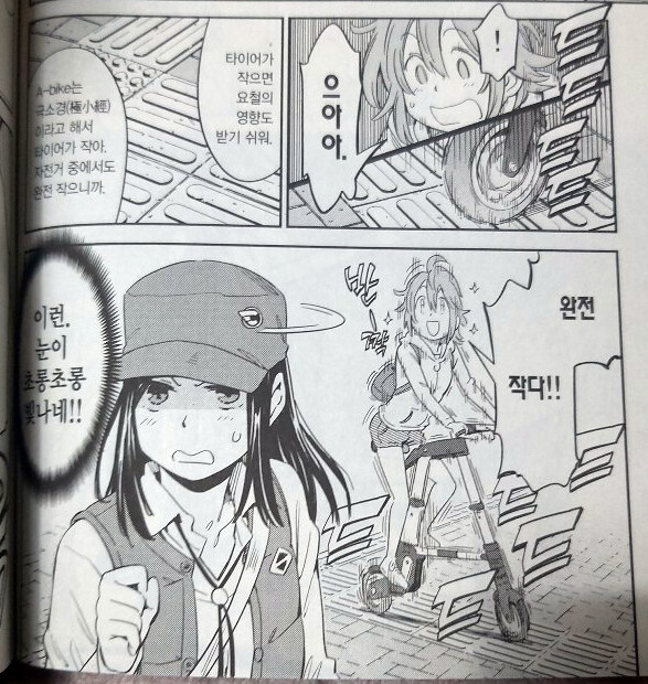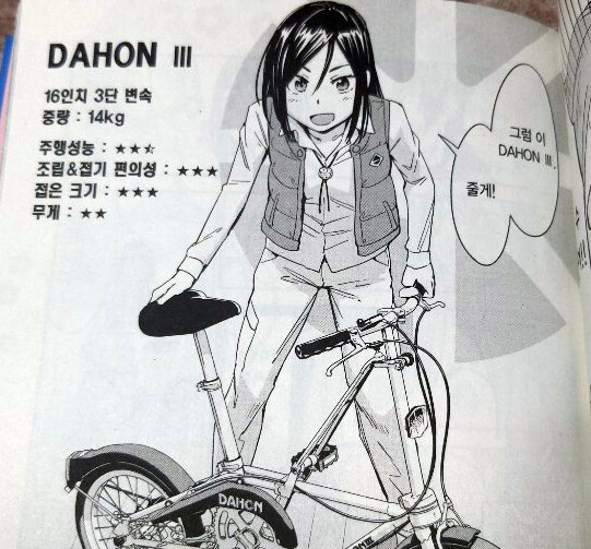 직접적인 자전거 모델 이름이나 특징, 접이식 자전거만의 이점 등을 보여주는 등 접이식 자전거만의 매력을 어필하는 느낌을 보여주고 있어서 색다른 모습을 보여주려는 시도를 많이 보여주는 듯 했습니다. 기존의 자전거 장르는 경기용이나 흔히 우리가 아는 큰 바퀴의 두발자전거였다면 이 만화에서는 바퀴도 줄어들고, 모양도 독특한 접이식 자전거를 보여주고 자전거의 또 다른 모습을 보여주는 것 같아 좋았습니다.