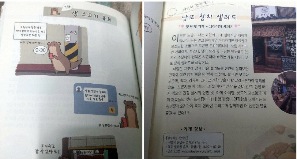 게다가 제가 좋아하는 일식/한식종류가 많기에 이런 쪽을 좋아하시는 분들에겐 적극 추천해드리고 싶네요. 또한 마지막에 이 음식을 취재한 곳에 대한 위치와 가게이름 등을 다 소개를 해주고 있던 부분도 좋았습니다. 저도 개인적으로 끌린 음식점이 몇군데 있어서 메모해서 가볼까도 싶은 생각이 들었습니다.