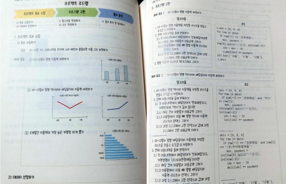그래서인지 이 책은 초반에 문법을 설명한 이후 후반부에는 심화문법과 함께 앞서 언급했던 패키지들을 실습하면서 여러 프로젝트를 만드는 것을 실험하고 있었다. 처음에는 pandas를 활용해서 간단한 데이터분석을 실행하면서 후반부에는 tkinter로 간단한 창안에 버튼이나 여러 내용을 보여줄 수 있도록 만들기까지. 쉬운 프로젝트부터 전공자들도 쉽게하기는 힘든 프로젝트까지. 난이도를 차근차근 높이면서 다양한 패키지를 실습하며 여러 프로그램을 만들 수 있는 그런 체계적인 프로젝트들을 정말 잘 정리하는게 좋았다고 생각이 든다.