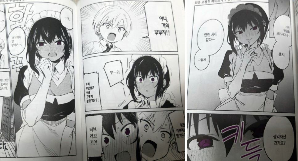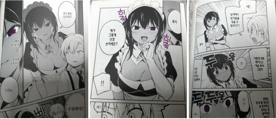 이 작품을 보면서 가장 눈에 띄는 점을 꼽으라면 단연 그림체라고 생각합니다. 보통 일본 만화의 단행본은 흑백만화로 구성되어 있습니다. 물론 이 만화로 흑백으로 구성이 되어있지만 여주인공인 메이드의 눈동자에만 보라색으로 칠하게 해서 묘한 분위기를 만들어 냅니다. 보라색 눈동자가 까만 피부와 메이드의 몸매까지 합쳐서 묘한 매력을 심고 있어 마치 유혹하는 듯한 그윽한 분위기를 만드는 데 사용을 합니다.