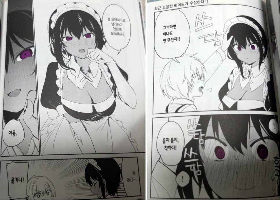 이번에 리뷰할 작품은 최근 고용한 메이드가 수상하다 1권입니다. '쟈히 님은 기죽지 않아'를 연재하셨던 콘부 와카메 작가님의 작품으로, 조금 더 찾아보니 트위터에서 연재도 했던 작품이더군요. 꼬마 도련님과 같이 사는 메이드가 장난을 치는 에피소드들을 담은 만화로 두 세 페이지의 짧은 분량 안에 한 화를 담은게 주요 특징입니다.