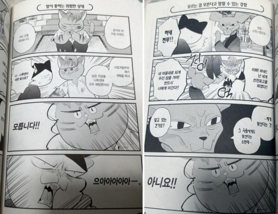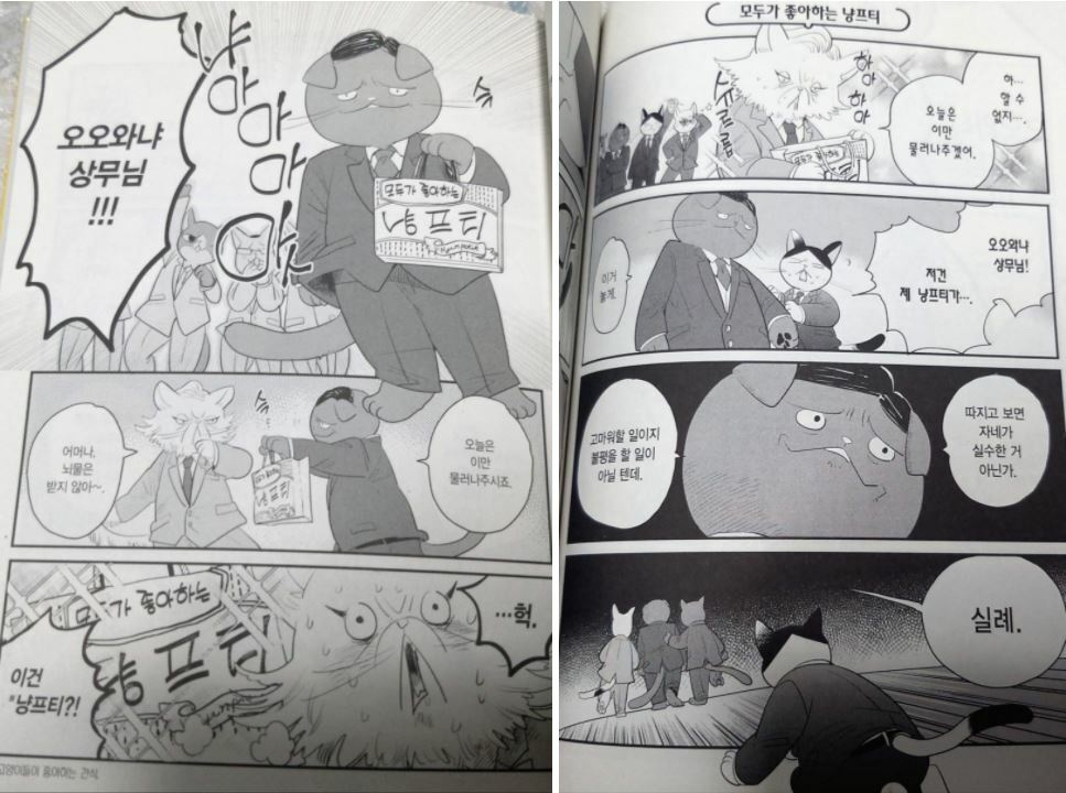 그렇기에 이 만화는 한자와 나오키를 모르는 일반 독자가 보면 약간은 이해하기 힘든 만화일수도 있을 것 같습니다. 그러니 만약 이 만화를 보고 싶다고 한다면 원작 소설을 잘 알고 있는 사람이 좀 더 재밌게 볼 수 있을 것 같기도 합니다. 물론 그걸 제외하고더라도 고양이가 회사생활을 하는 개그만화로 봐도 되지만 그런 시각으로 보기에는 약간은 부족함이 드러나는 만화기도 하고, 개그 코드가 약간 부족하다고도 느껴지기에 적어도 원작소설의 내용은 아는 상태에서 재미로 즐겨주시면 좋을 듯 하네요.