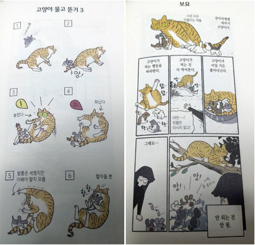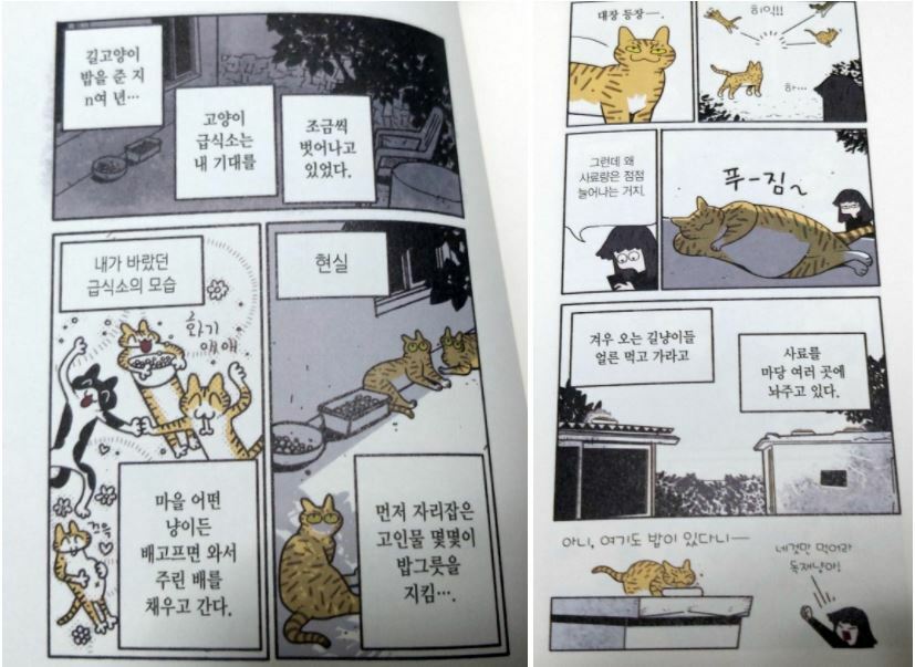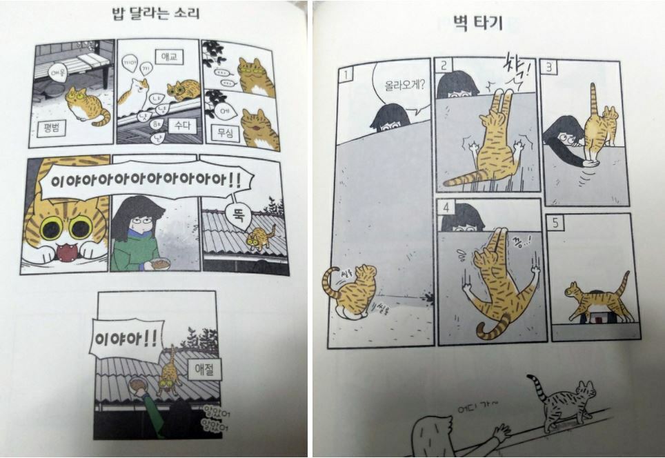 또한 기르다보면 생기는 웃긴 상황들도 자주 등장하는데, 가령 비가 오는날에 비를 다맞고 밖에 버티는 모습들이나 밥을 먹기 위해 쫄래쫄래 따라다니는 행동들 등등 그림인데도 실제 영상으로 보이는 듯한 그런 생동감 넘치는 귀여운 모습에 절로 미소가 지어지고 고양이를 키우고 싶다는 생각이 절로 간절하게 들 만큼 힐링이 되는 순간이 무척이나 많았다.