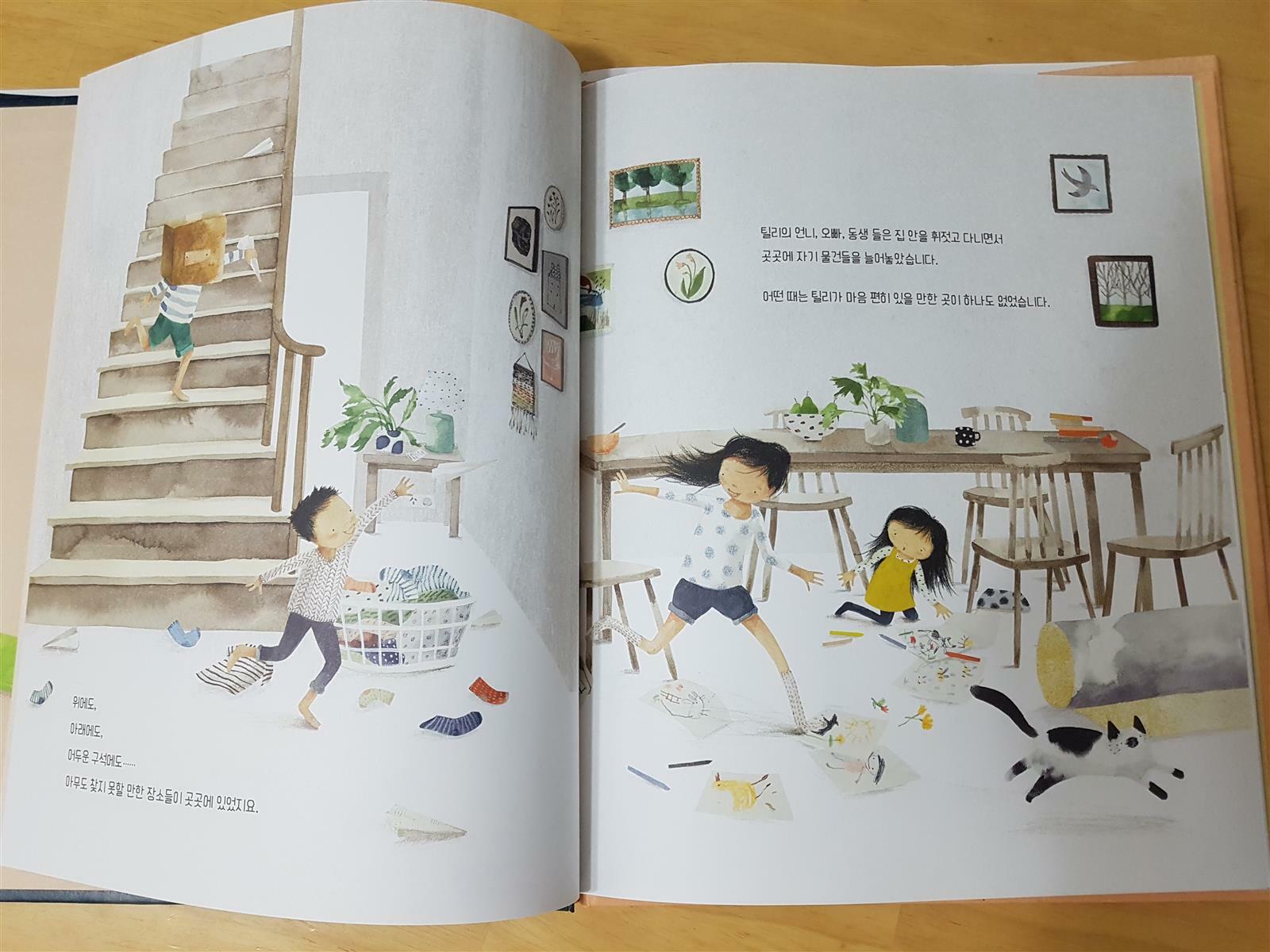 틸리는 언니, 오빠, 동생들이 뛰어다니며 온종일 집안을 휘젓고 다니는 통에 마음 편히 지낼 수가 없는 같다. 식탁밑에 있는 틸리는 조용한 아이? 내성적인 아이? 혼자만의 시간을 즐기는 아이?인가 보다. 자기만의 비밀 장소를 찾아내고 계단속 비밀장소에 자기만의 보물들(공책, 새그림, 돌멩이, 은색공, 과자, 편지, 인형)을 보관한다. 틸리는 가끔 보물들을 꺼내서 늘어놓기도 하지만, 보물들이 거기에 있다는 사실만으로도 기분이 좋은가보다. 자신의 보물들이 오직 자기만 아는 곳에 안전하게 보관돼 있다는 사실에 만족을 한다. 하지만 예상치 못한 상황으로 인해 엄청나게 실망한다.