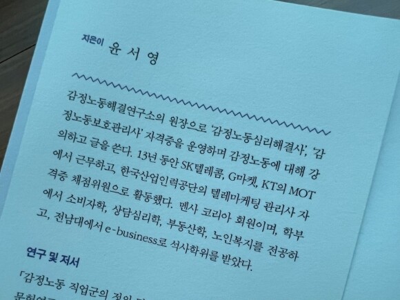 감정 노동 해결연구소의 원장, 감정노동심리해결사, 감정노동 보호 관리사 자격증을 운영, 상담심리학을 전공했네요..
