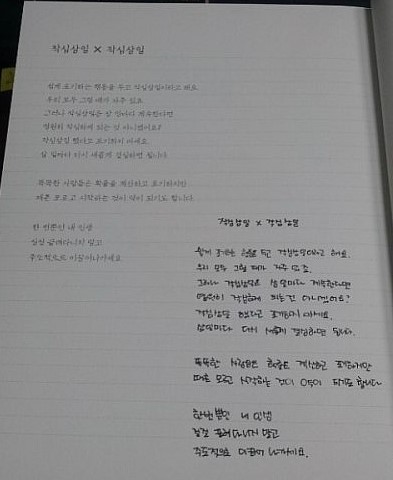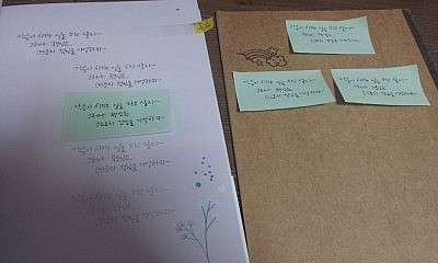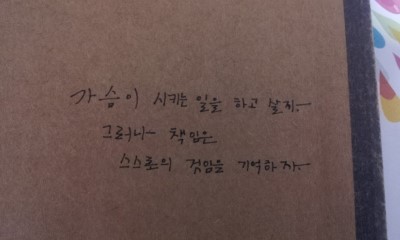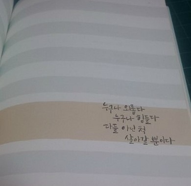 내가 펼친 곳은 자연경관, 그것도 밤 어두운 배경의 고마움을 알라는 페이지로 별이 더 밝게 보이는 이유는 그 배경이 되어준 어둠이 있어서라는 짧막한 이야기가 담긴 페이지로, 내가 지금에 있기까지 내 주변도 돌아볼 줄 아는 사람이 되어야 겠다는 생각도 들도, 지금 현실에 누군가 빛을 보지만 그 밖의 많은 사람들도 있다는 생각이 드는 등의 많은 의미를 내포한 글귀라는 생각이 들었다.