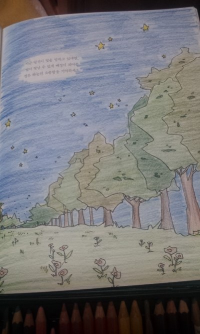 일부러 별과 달을 칠하고, 한쪽에만 먼져 배경을 칠하기 시작했다. 정말 글귀 구절대로 푸른 색의 배경이 있어서 별이 더 빛나는 것이 아닌가 라는 생각이 들었다.