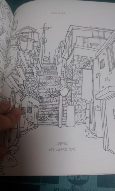위의 그림의 경우에는 예전 1박2일의 이승기씨가 다녀간 혜화동의 벽화마을이다. 올 여름에 친구랑 함께 연극 보기전 벽화를 보러 한바퀴 쭉 돌면서 봤던 곳인데 그림으로도 있으니 감회가 새롭고, 어떻게 색칠하면 될지 눈에 선명하다. 이밖에도 서울의 곳곳의 풍경이 있거나 커피와 커피잔, 그리고 책이 잔득 있는 방한 구석도 있고 자연들도 있어서 여느 컬러링북과는 조금 익숙하면서 재미있다는 생각을 많이 가지게 되었다.