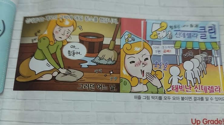 두쪽씩 했을때는 교재 뒷편에 퍼즐 그림딱지를 떼어 단원이 완성하면 바로 두컷 만화가 완성이 된다.