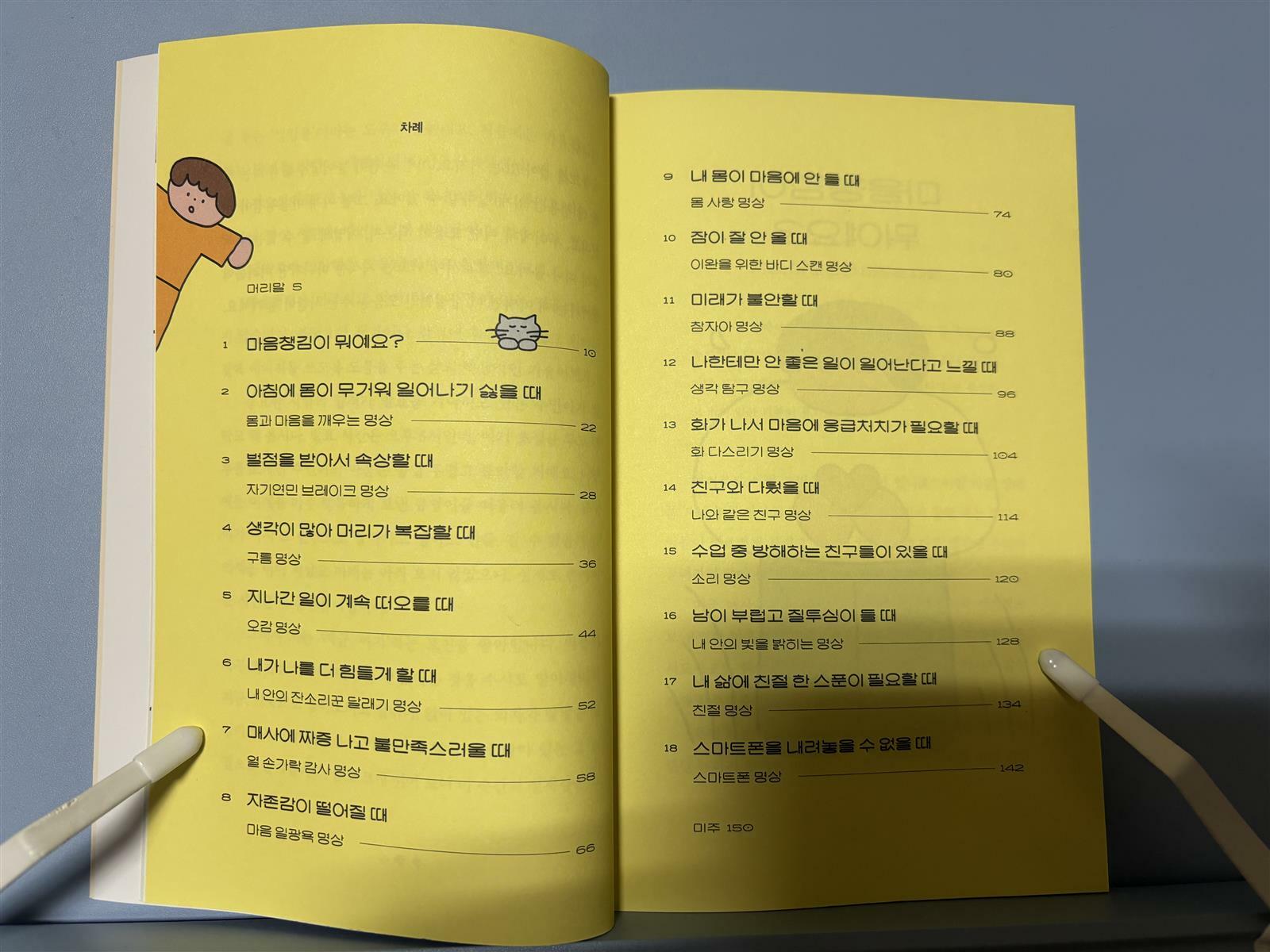 벌점을 받아서 속상할 때-자기 연민 브레이크 명상, 생각이 많아 머리가 복잡할 때-오감 명상, 내가 나를 더 힘들게 할 때-내 안의 잔소리꾼 달래기 명상, 자존감이 떨어질 때-마음 일광욕 명상, 잠이 잘 안 올 때-이완을 위한 바디 스캔 명상 등………. 여러 명상들이 소개되어 있는데,
