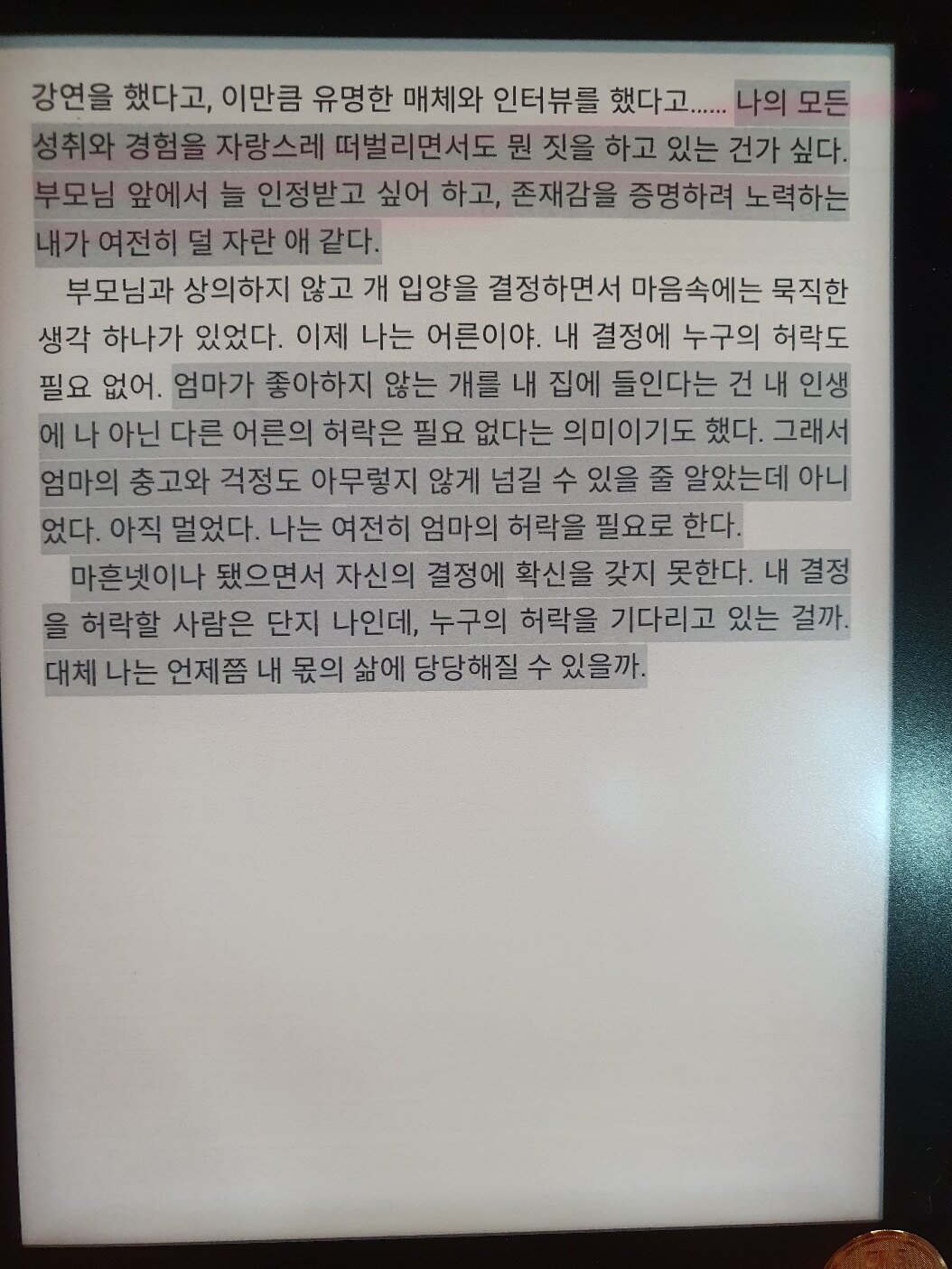 김신회 작가님의 이 솔직담백한 에세이를 읽으며 내 자신을 깊이 들여다보게 된다. 서른의 나는 아직 온전한 어른 같지 않은데, 10년 후 마흔의 내가 조금 더 어른스러워지려면 내게 필요한건 어떤걸까..? 누군가에게 인정받으려 애쓰기보다 스스로를 인정하는 그 마음이 생길때 비로소 어른에 다가가는 걸까? 싶다.