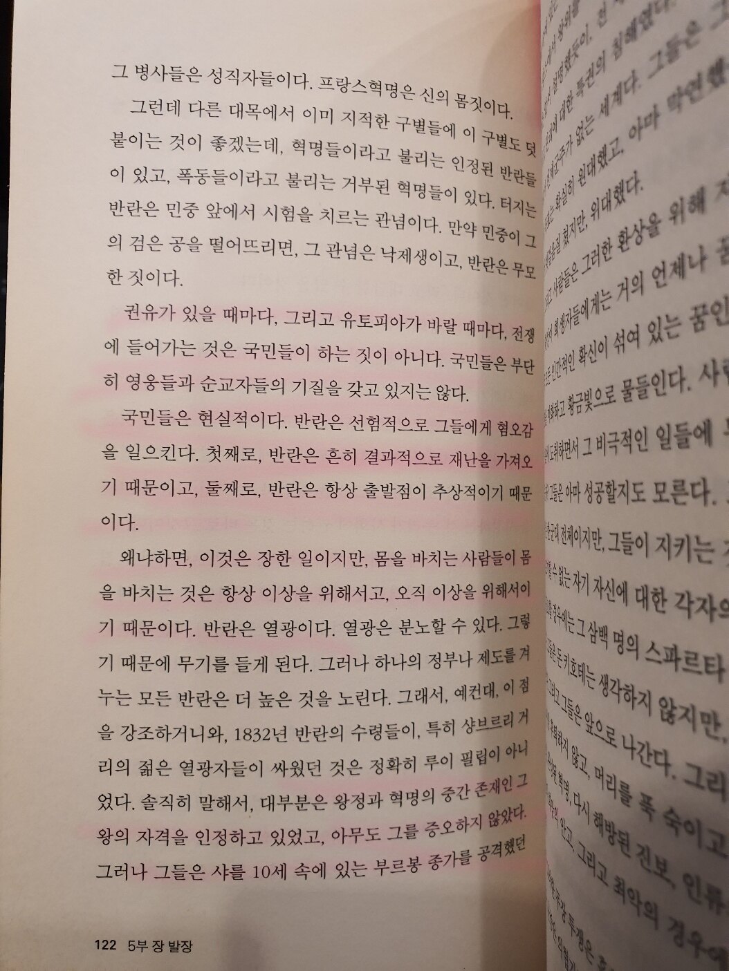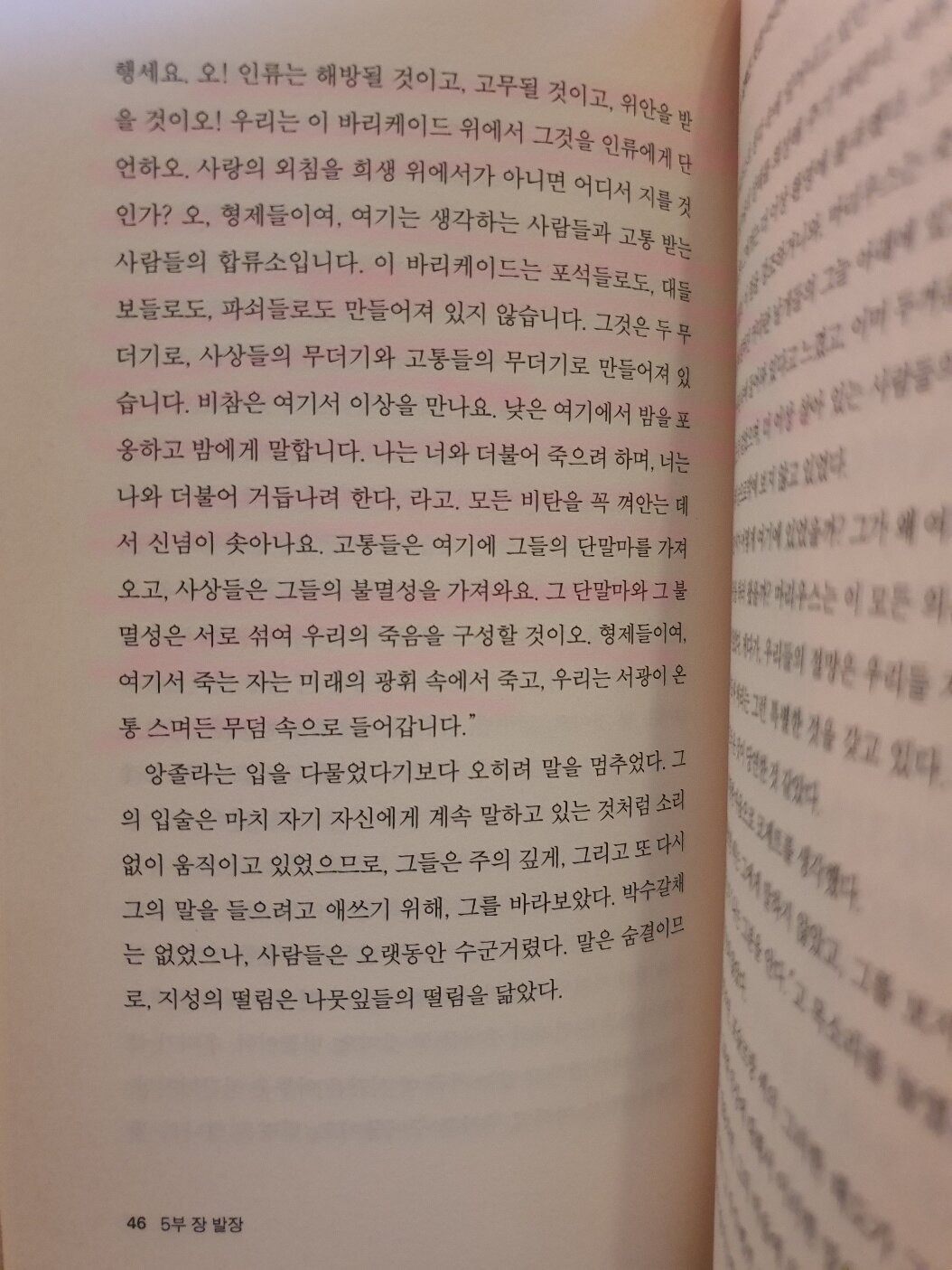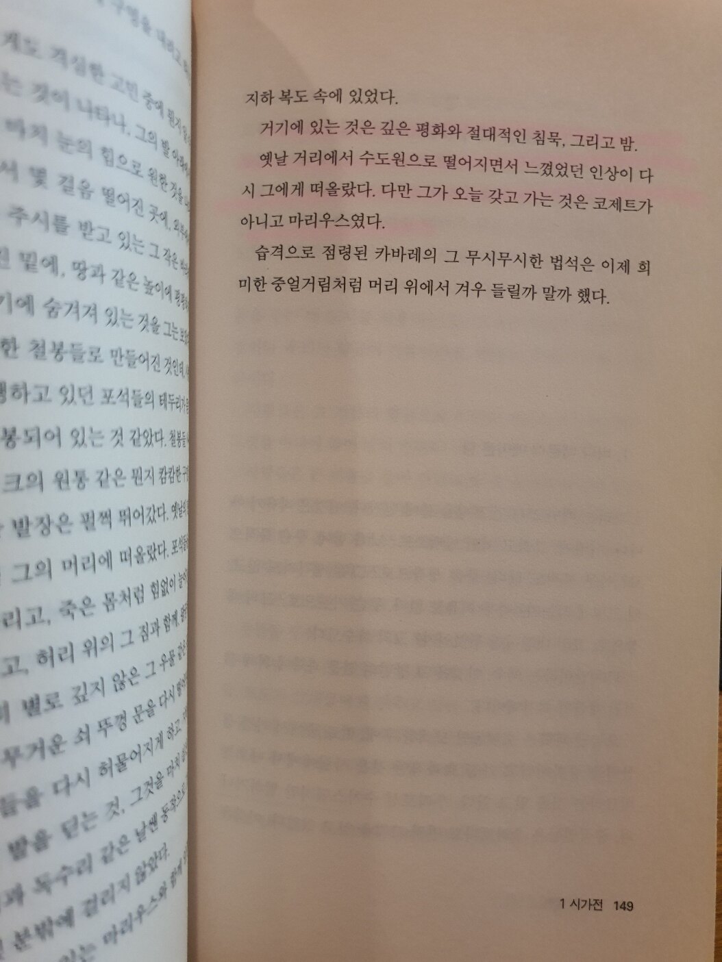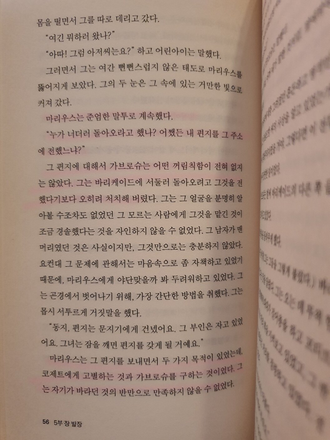 5부 1장을 읽는데 혁명을 둘러싼 저자의 생각과 의견이 여러모로 잘 나타나있어서 유의미하다. 자베르를 죽이지 않은 장발장의 선택은 영화로 보나 책으로보나 장발장의 덕성을 잘 드러내는 장면이며 자베르에게는 크나큰 영향을 미치고있다.