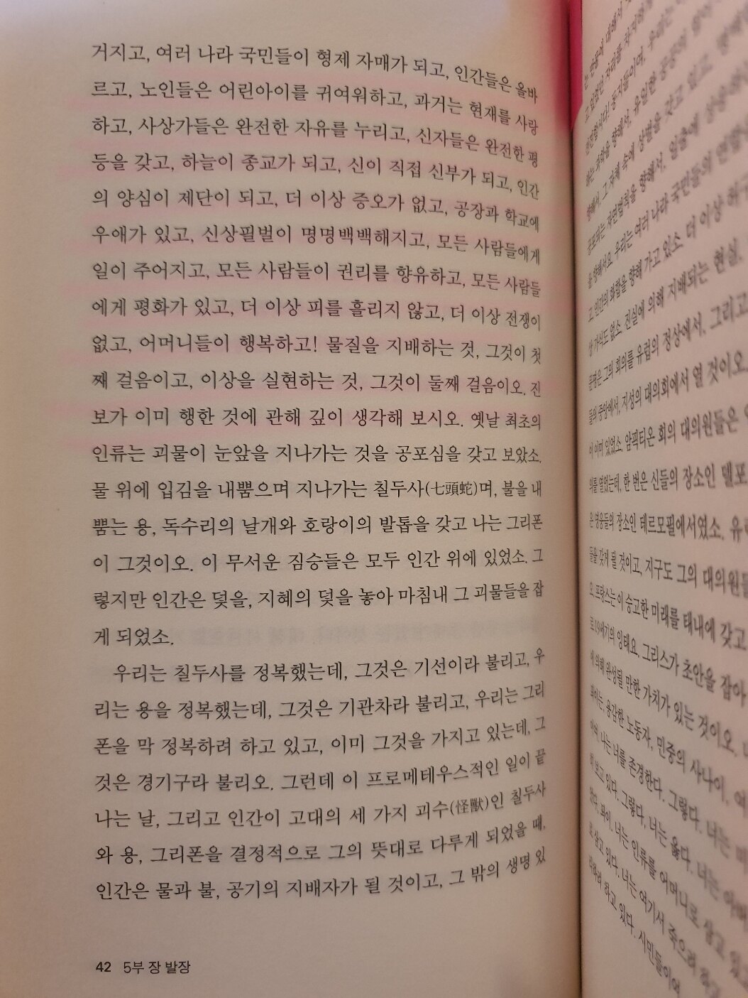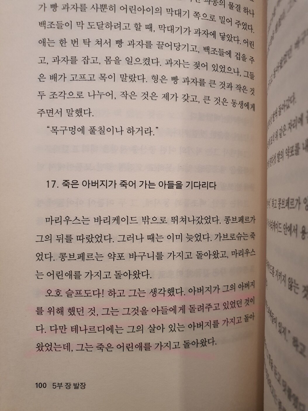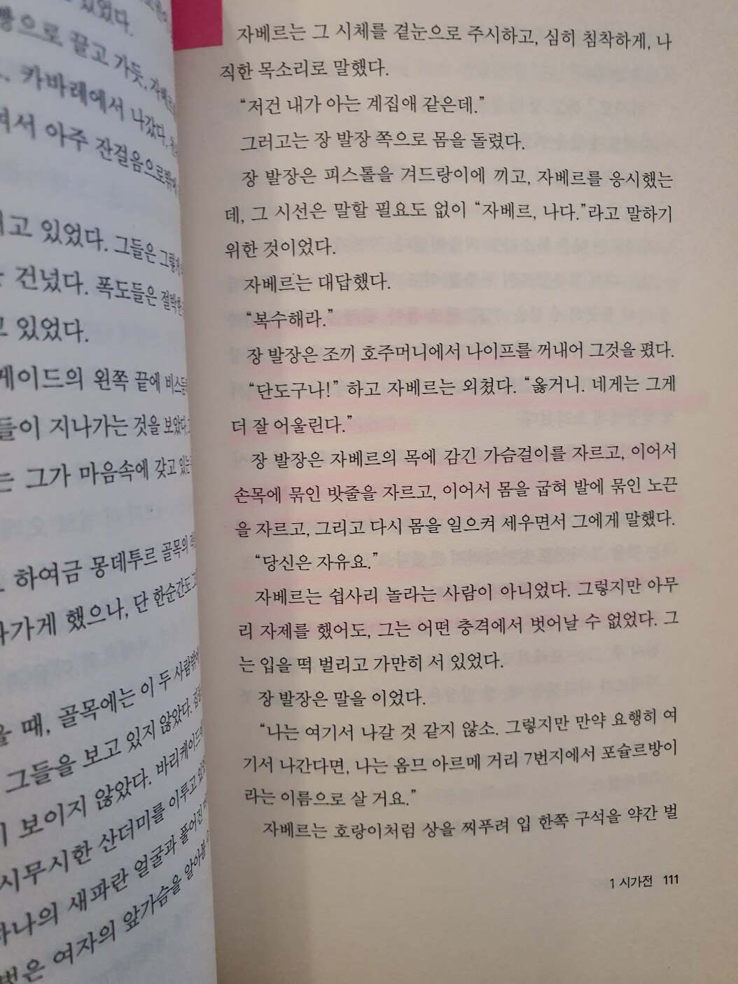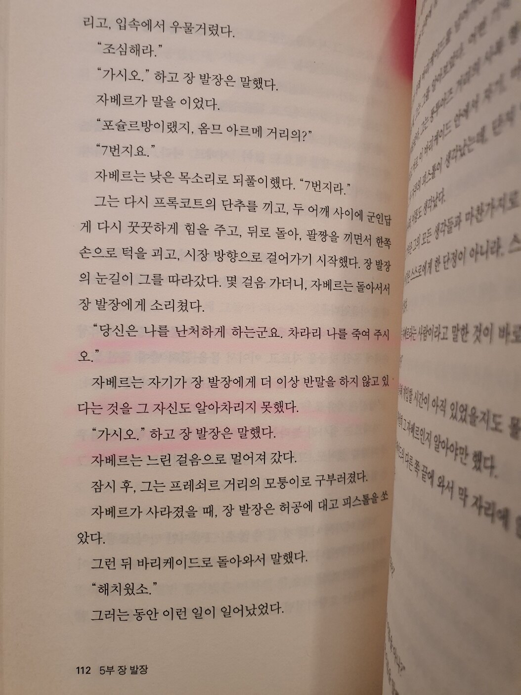 5부 1장을 읽는데 혁명을 둘러싼 저자의 생각과 의견이 여러모로 잘 나타나있어서 유의미하다. 자베르를 죽이지 않은 장발장의 선택은 영화로 보나 책으로보나 장발장의 덕성을 잘 드러내는 장면이며 자베르에게는 크나큰 영향을 미치고있다.