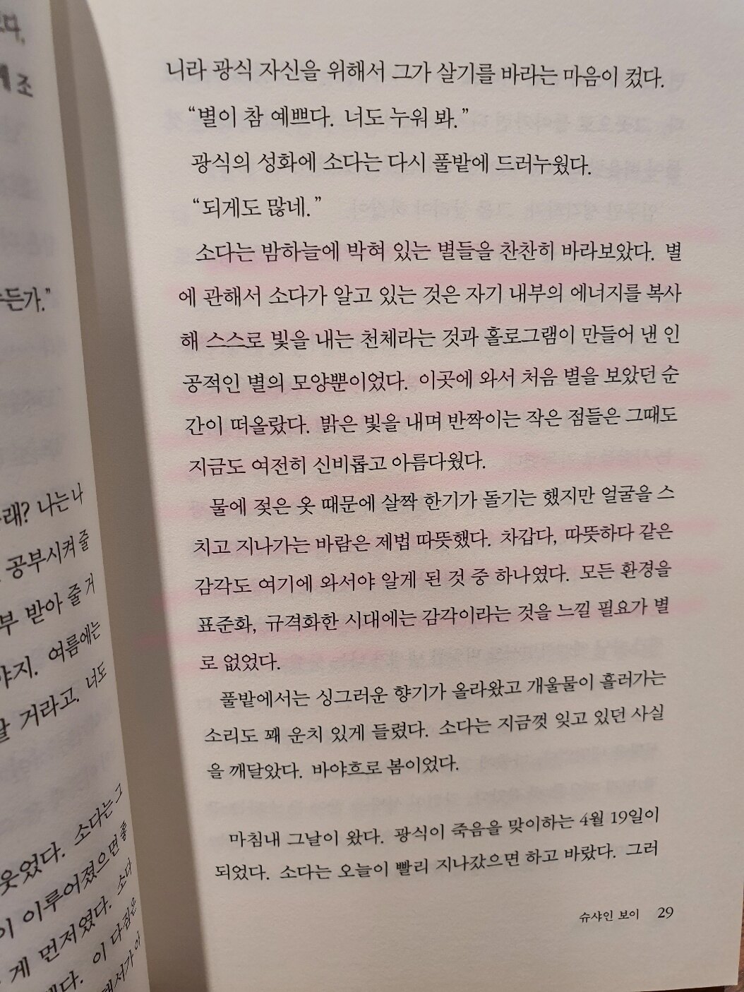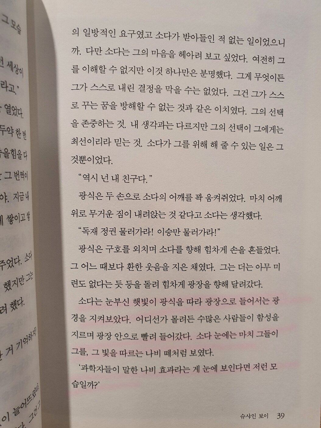 → 나폴레옹과 자유를 동시에 좋아한다는 프랑스인들의 이 모순은, 어딘가 낯설지 않은 것이 - ‘강한 힘’을 지닌 대통령(정치인)이 나타나기를 바라면서도 동시에 민주주의를 소망했던 한국 사회의 7-80년대 모습이 아닐까 싶었다. 시대적 혼란 속에서, 특히 성장 과정에서 듣고 배워온 정치관과 정 반대의 극으로 나아가게 된 마리우스가 무엇보다 흥미로웠는데, 사실 청년세대가 진보를 추구하고 기성세대가 보수화 되는 것은 그 시대의 프랑스나, 2021년의 한국 사회나 유사한 것 같다. 그래서 질노르망 씨가 그의 의견에 찬동만 하는 ‘테오뒬’에게 “넌 멍텅구리구나.”라고 하지 않았을까.(P222.)