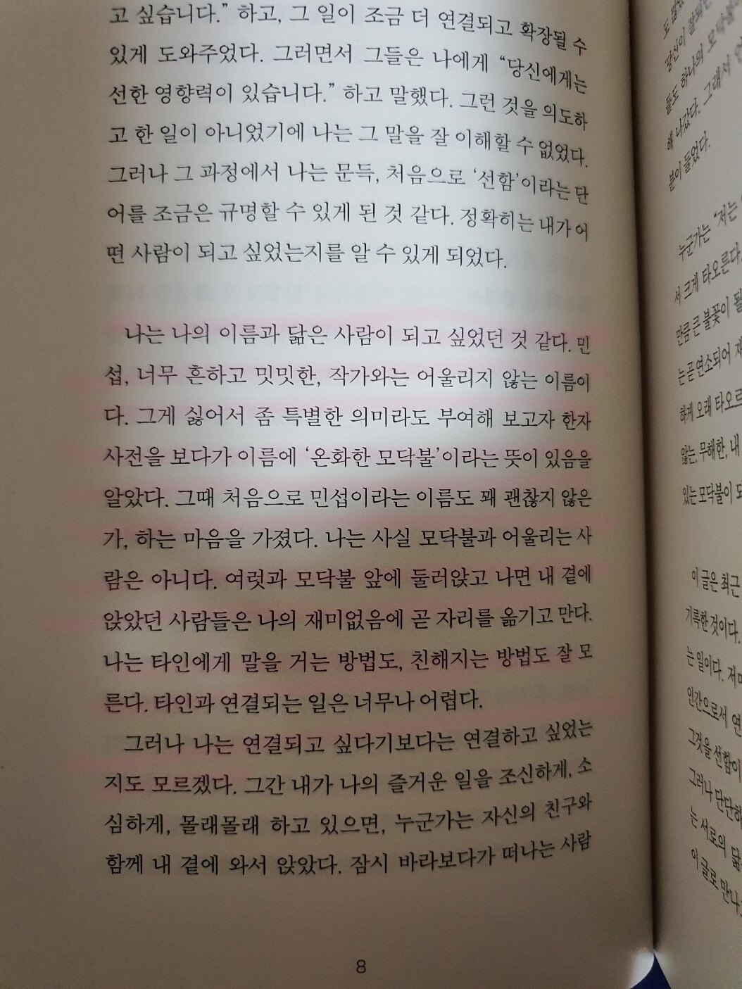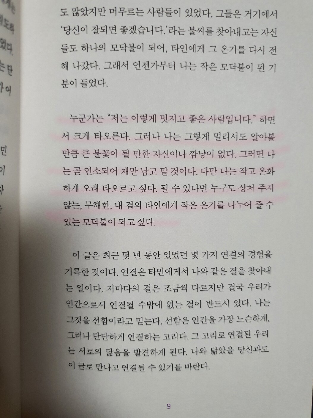 내가 좋아하고 존경하는 분들은 글과 언행을 통해 늘 인격적으로 닮고픈 분들인데 특히나 김민섭작가님께는 참으로 깊이..그 선한 영향력이 느껴지는 것 같다. 세상과 소통하고 싶으나 내향적인 아이였고 그래서 책을통해 세상을 만났던 나도 마음속에 나만의 모닥불을 피워나갔는지도 모르겠다.