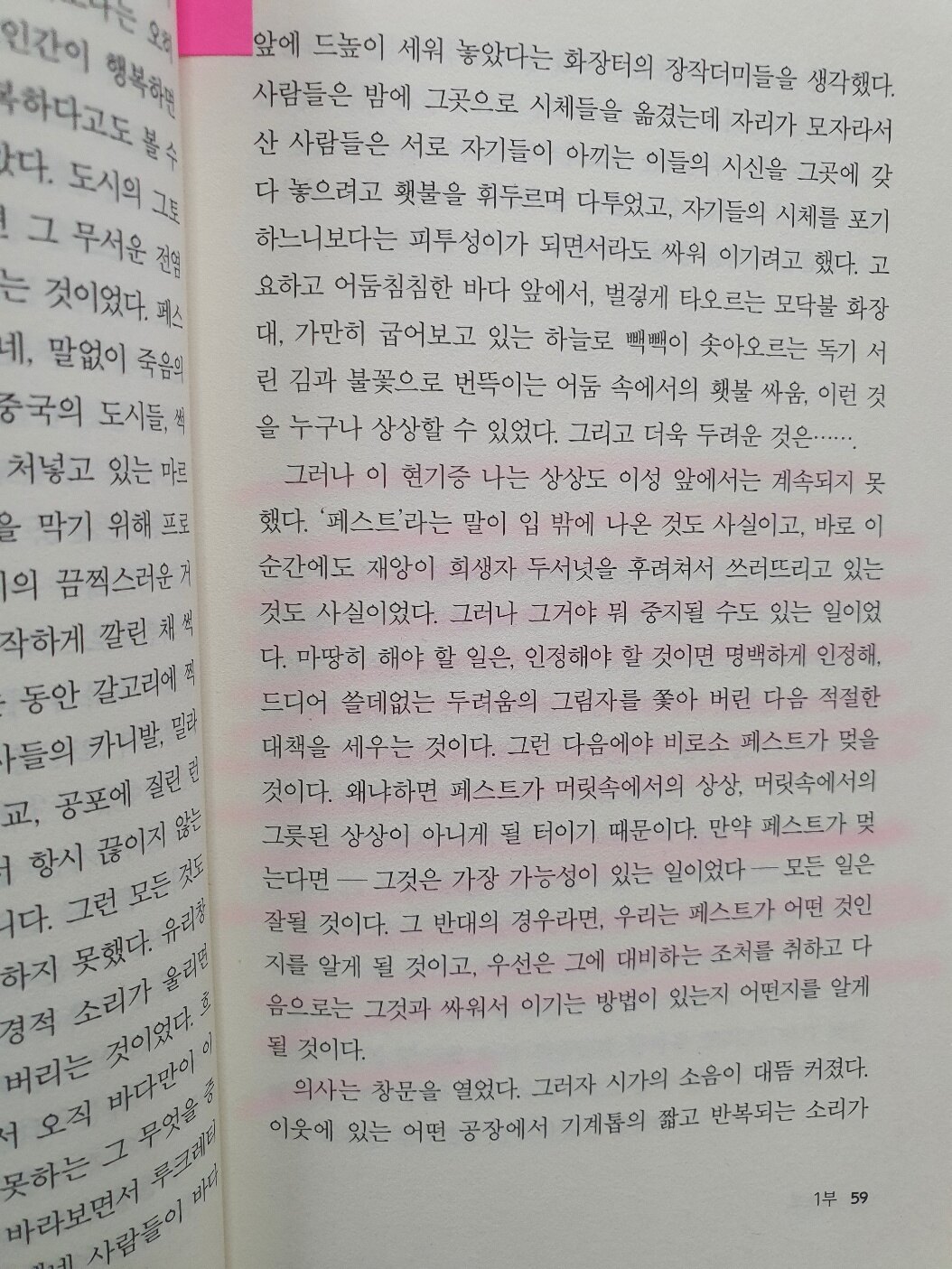 그래도 그는 이 연대기가 결정적인 승리의 기록일 수 없다는 것을 알고 있었다. 이 기록은 다만 공포와 그 공포가 지니고 있는 악착같은 무기에 대항하여 수행해 나가야 했던 것, 그리고 성자가 될 수도 없고 재앙을 용납할 수도 없기에 그 대신 의사가 되겠다고 노력하는 모든 사람들이 그들의 개인적인 고통에도 불구하고 아직도 수행해 나가야 할 것에 대한 증언일 뿐이다.
