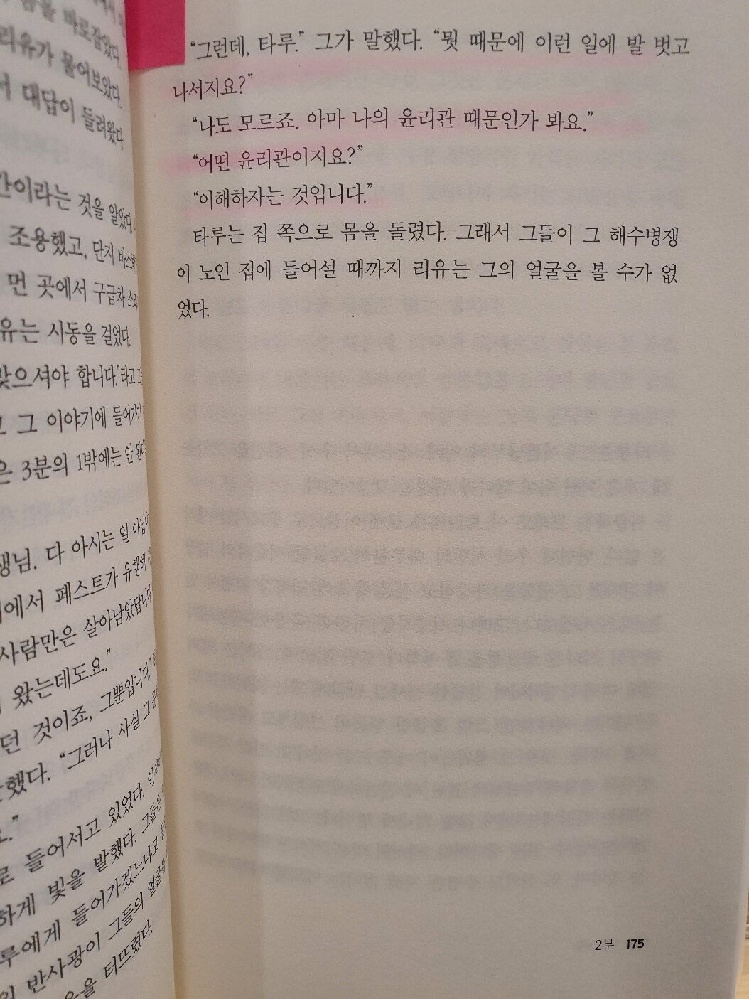 타루는 이야기를 맺으면서, 다리 한쪽을 흔들다가 테라스 바닥을 가볍게 탁탁 치는 것이었다. 잠시 동안 묵묵히 있던 의사는 몸을 약간 일으키면서 타루에게, 마음의 평화에 도달하기 위해서 걸어야 할 길이 어떤 것일지 생각해 본 적이 있느냐고 물었다.