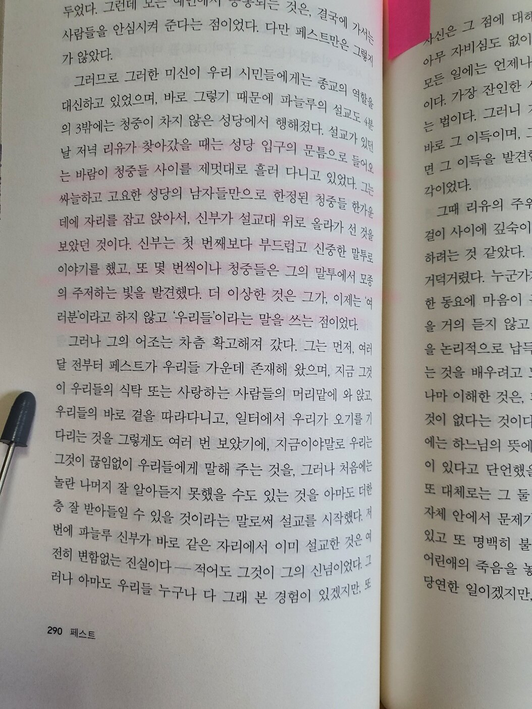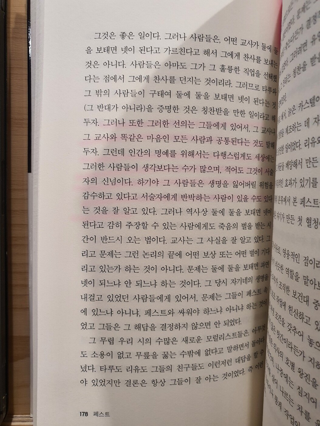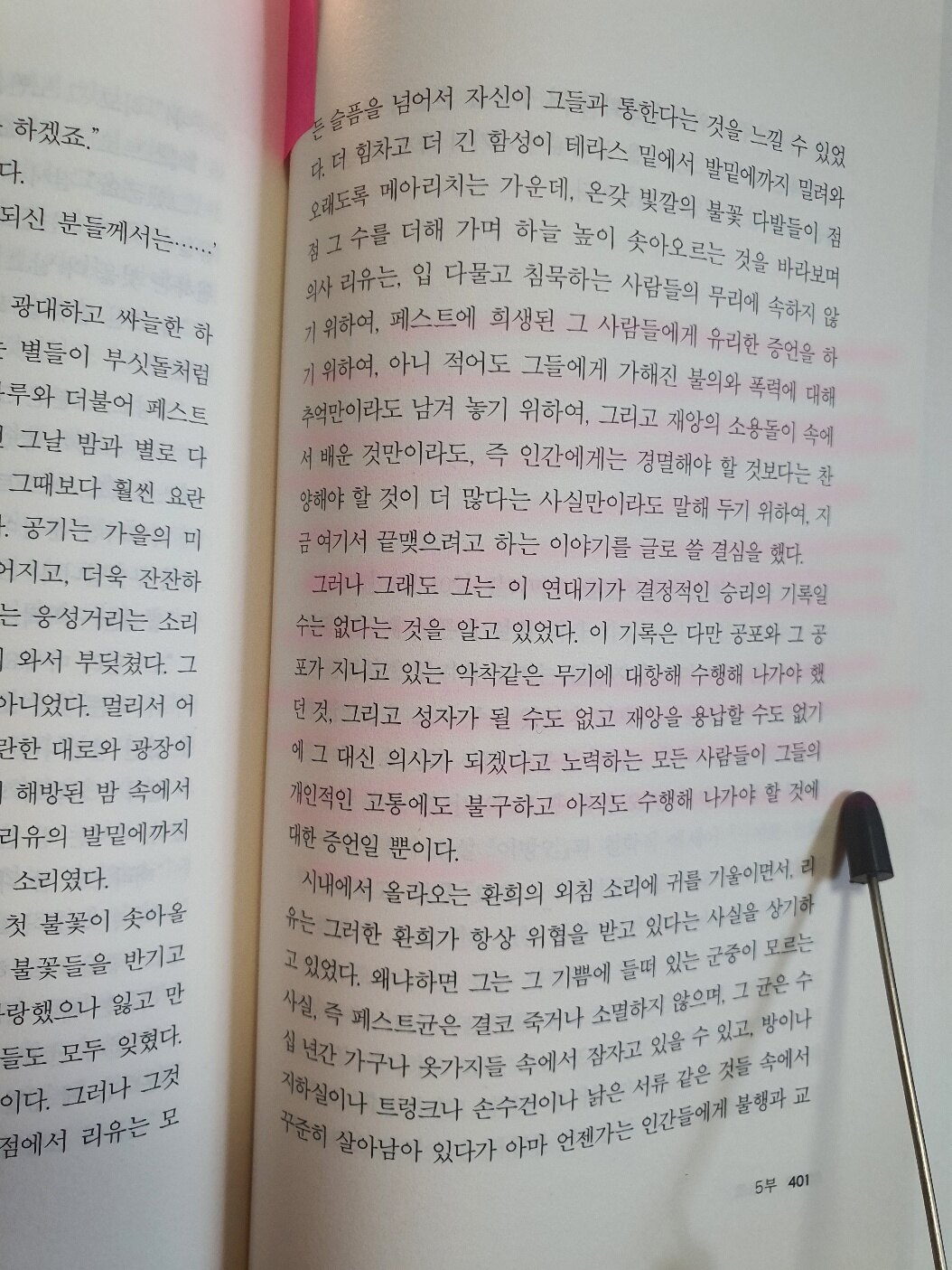 “입 다물고 침묵하는 사람들의 무리에 속하지 않기 위하여, 페스트에 희생된 그 사람들에게 유리한 증언을 하기 위하여, 아니 적어도 그들에게 가해진 불의와 폭력에 대해 추억만이라도 남겨놓기 위하여, 그리고 재앙의 소용돌이 속에서 배운 것만이라도, 즉 인간에게는 경멸해야 할 것보다는 찬양해야 할 것이 더 많다는 사실만이라도 말해두기 위하여, 지금 여기서 끝맺으려고 하는 이야기를 글로 쓸 결심을 했다.”