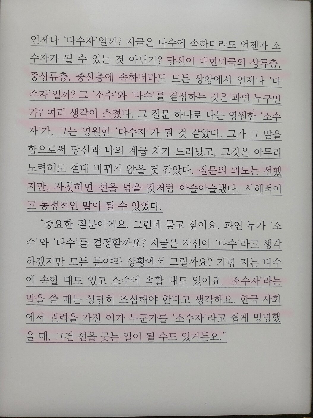전에 <선량한 차별주의자>에서 읽었던 내용이 여기서도 다시금 등장했다. 누구나 어떤 상황에서는 다수자일 수도 있고 다른 상황에서는 소수자가 될 수 있다. 자신이 언제나 다수자라고 상정하는 건 매우 위험한 사고라 여긴다. 사회 구성원들이 스스로나 소수자의 입장일때를 떠올리며 함께 만들어가는 사회이기를 진실로 바란다.