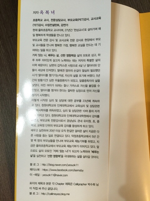 선생님은 현재 초등학교 교사로 재직중이시며 전문상담, 그리고 부모교육강사, 수업컨설턴트, 박사 등등 너무나 많은 교육분야에