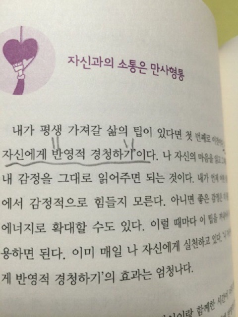 본인이 항상 견뎌온 비법에 대해서도 알려줍니다. 자신에게 칭찬으로 하고 자신의 목소리에 경청을 하는 방벙, 그리고 공감을 해주는
