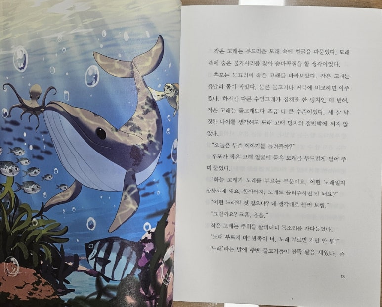 2장 토끼와 거북에서는 토끼가 거북의 끈기와 성실, 지혜를 칭찬하고 거북은 토끼의 용기있는 행동을 칭찬하는 것으로 서로의 재능과 노력을 이야기합니다.