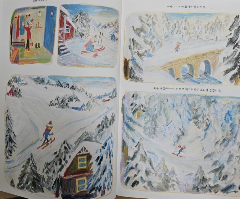 한껏 불안해진 소년은 스키를 신고 눈 속으로 나와 이리저리 몸을 흔들다가 그만 구덩이 속에 빠지고 맙니다.
