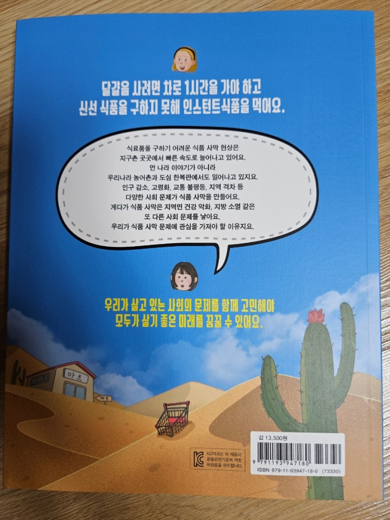 이번 책을 통해 식품 사막이라는 심각한 사회문제를 직면할 수 있었고, 어린이들도 사회문제에 전혀 상관없는 사람들이 아니라 소중한 한 사람 한 사람으로서 인식해가는 좋은 기회가 될 것 같습니다.