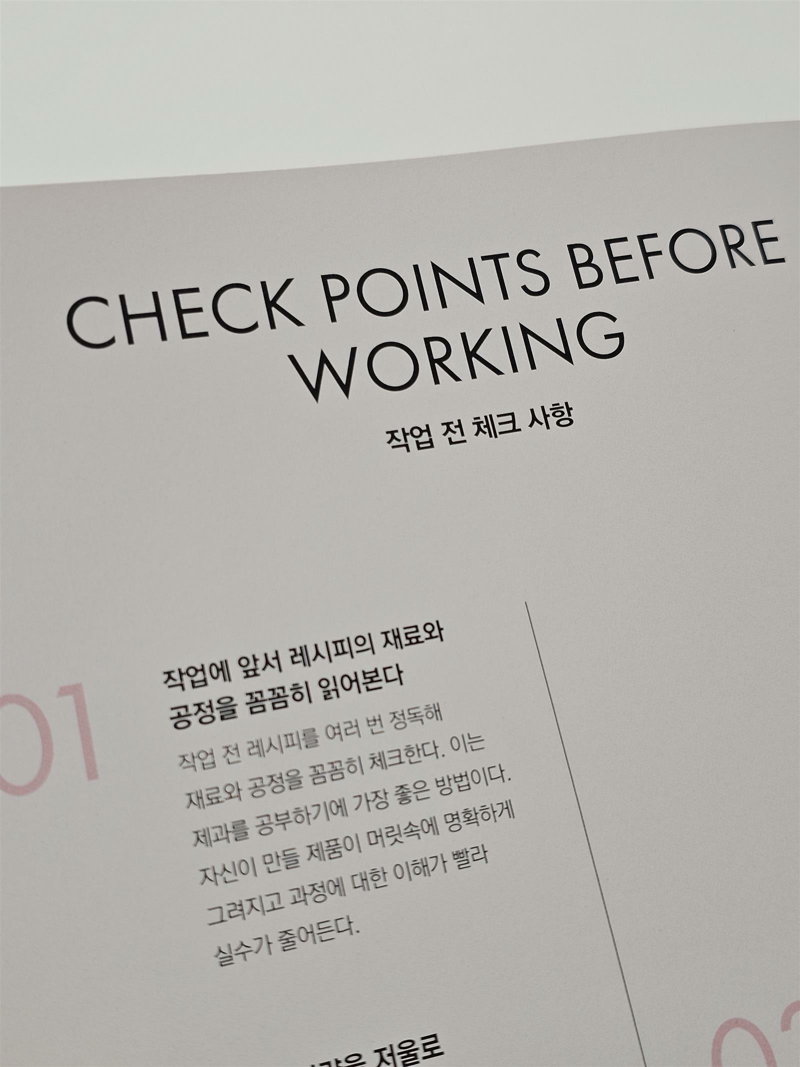 책의 표지도 너무 고급스럽고 튼튼해서 겉표지 구김염려가 없네요 😄 이 책은 그동안 3000명이 넘는 수강생을 가르치시고 50편의 제과 교육 동영상까지 제작하신 존경스러운 김수경 쉐프님의 수많은 경험을 바탕으로 쉐프님의 12년 동안의 경험과 노하우가 고스란히 담겨있다고 해요 🙂 내용도 탄탄하고 알찰 것 같아 기대가 됩니다ㅎㅎ 확실히 상급편이다보니 초급편과 다르게 난이도가 있는 편이지만 그래도 쉐프님의 설명에 따라 하나씩 차근차근 따라 만들면 금방 뚝딱 완성품이 나올 것만 같아요! 🤣 시작에 앞서 작업 전 체크 사항이 10가지가 있는데 이또한 중요한 노하우이지 않을까 싶어 신간이니 일부만 공개하겠습니다 🙃 10가지 모두 읽어보니 기본적인 것들 이지만 이것들을 무시하면 결과에 큰 영향을 줄것 같아요 만들기전에 꼭 읽어보시기를 추천드립니다🙂 상급편 책에는 마들렌이 나오지 않지만 마들렌 틀에 관하여 플렉시판과 철판 이 두가지의 비교점들이 잘 작혀있어서 너무 유용한 것 같아요~! 저 같은 경우는 집에 플렉시판, 철판 둘다 있지만 플렉시판은 아직 오픈을 못했어요🫠 보관이나 다루기가 조금 까다롭다고 하여 손이 잘 안가더라구요..; 근데 이번 상급편 책에는 마들렌 틀별 사용온도와 기능, 주의점 등이 잘 적혀 있어서 비교해가며 사용해볼 수 있을 것 같아요! 이 외에도 생크림 휘핑의 퍼센트별 정도, 견과류 로스팅 및 보관 방법, 제과에 사용되는 소금 종류의 설명과 저한테 가장 어려운 초콜릿 템퍼링 방법! 그리고 활용 크림에 대한 크림별 설명이 잘 나와있어서 유용한 정보들이 너무 많네요 👍 레시피는 총 23개의 레시피가 있지만 타르트나 크림 등 만드는 방법이나 각각의 재료를 응용하여 사용할 수 있을 것 같아 저에겐 더 유용합니다🙂 제가 좋아하는~? 먹고 싶은 디저트들을 위주로 찍어봤어요^^ 1번으로 리프파이! 이건 누구나 좋아할 것 같아요.. 호불호가 없을 것 같은..맛이 없을 수 없는 맛이죠😋 바삭바삭 넘 맛있어 보이네요^^ 플랑! 크림디저트 완전 취저인데 그동안 제대로 된 플랑은 안먹어봐서 넘 만들어보고 싶은 품목중 한가지에요😋 파이롤러를 사용한 것도 아닌데 손으로 어쩜 이렇게 잘 만드시는지 꼭 한번쯤 따라해 보고 싶은 파이류이네요.. 특히 밀푀유는 항상 해보고 싶다 생각만하고 아직 못만들어본 품목중에 하나인데 이것도 킵해둡니다..ㅎㅎ 요즘 딸기철이라 딸기 디저트도 눈에 확 들어오더라구요~~^^ 이것도 공정이 꽤나 많지만 딸기철이 지나기전에 꼭 만들어 보고 싶은 품목입니다🙂 꿀에서 이미 맛있을 것 같아 찝어 두었어요🤣🤣 사실 이거 만들어서 후기에 함께 쓰려고 했는데 사워크림과 잔탄검이 없어서 김 새버렸네요..🫠 비주얼이 너무너무 예쁜 무스♡ 자두맛 제과라니 한번도 먹어보지 못해 상상이 되다 말았습니다 🤣 이것도 너무 궁굼해요! 바닐하향 진하게 날것 같은 이건 그냥 먹고싶은 비주얼.. 완전히 갠취입니당ㅎㅎ 요즘 체리도 많이 보여 만들어 보고 싶어서 찍어두었어요🙂 재료에 통카빈도 들어가기에 풍미도 장난 아닐 것 같아요! 통카빈과 초콜릿이 잘 어울린다고 하던데 통카빈이 다크 초콜릿 무스에 활용 되네요^^ 책 한권을 쭉 다 살펴보니 디저트 투어 다녀온 것 같아요!😄 눈으로도 입으로도 넘 맛있을 것 같은 디저트들이 한가득이라 눈호강 했어요..😋 김수경 쉐프님의 12년동안의 경험과 노하우가 고스란히 느껴지는 와닿는 책이였습니다👍💯 좋은책 출간해 주셔서 감사드려요🙏🥰