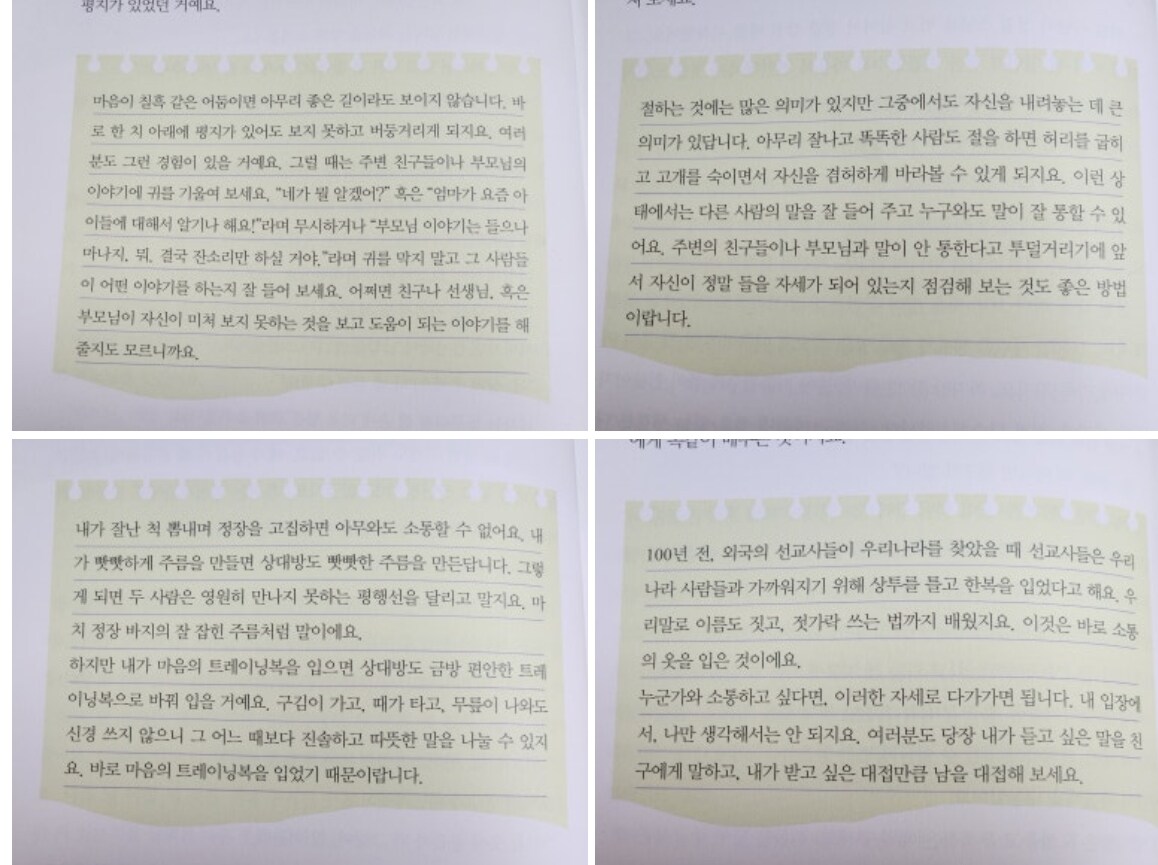 부모로서 아이의 마음을 들여다 보기 위해 읽기 시작했지만 아이에게도 내용을 전달하고 함께 읽으며 진정한 소통이 무엇인지, 아이가 속한 사회에서 훌륭하게 소통할 수 있는 방법은 어떤 것인지 함께 살펴볼 수 있어 소통을 위한 도움닫기를 할 수 있었어요.