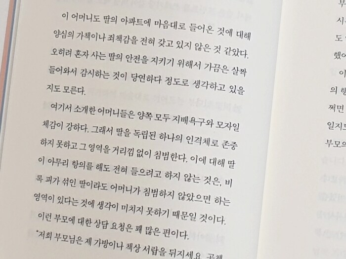 책을 읽다가 욱!했던 부분이다. 개인적으로 주변에 아파트 열쇠를 달라고 하거나 함부로 번호키를 누르고 들어오는 부모들 이야기를 종종 들었던 터라 더 반발심이 생겼던 것 같다. 혼자 사는 딸의 안전이 걱정된다면 딸과 협의해 열쇠를 가지고 있는것은 괜찮은것 같다. 하지만 평소에는 방문시 벨을 누르고, 부재중 방문시에는 딸의 허락이 필요하다고 본다. 부모와 자식간에도 엄연히 자기가 지키고 싶은 영역이 있다. 서로 지킬것은 지키자