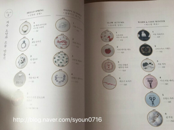 표지에서부터 아기자기한 자수 작품이 눈낄을 끈다. 자수에 필요한 용품이 담겨 있는데 호기심을 자극한다. 프랑스 자수의 기초, 자수 도안과 소품만들기 두 파트로 이루어져 있다.
