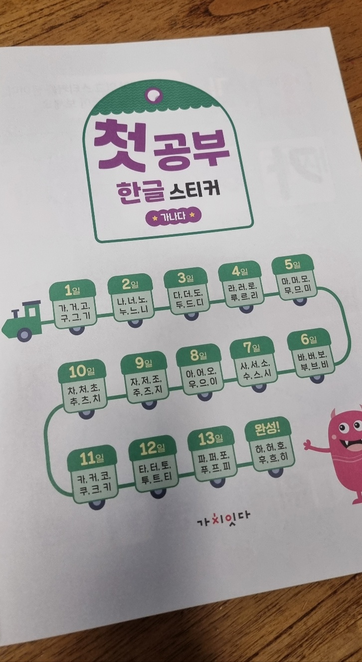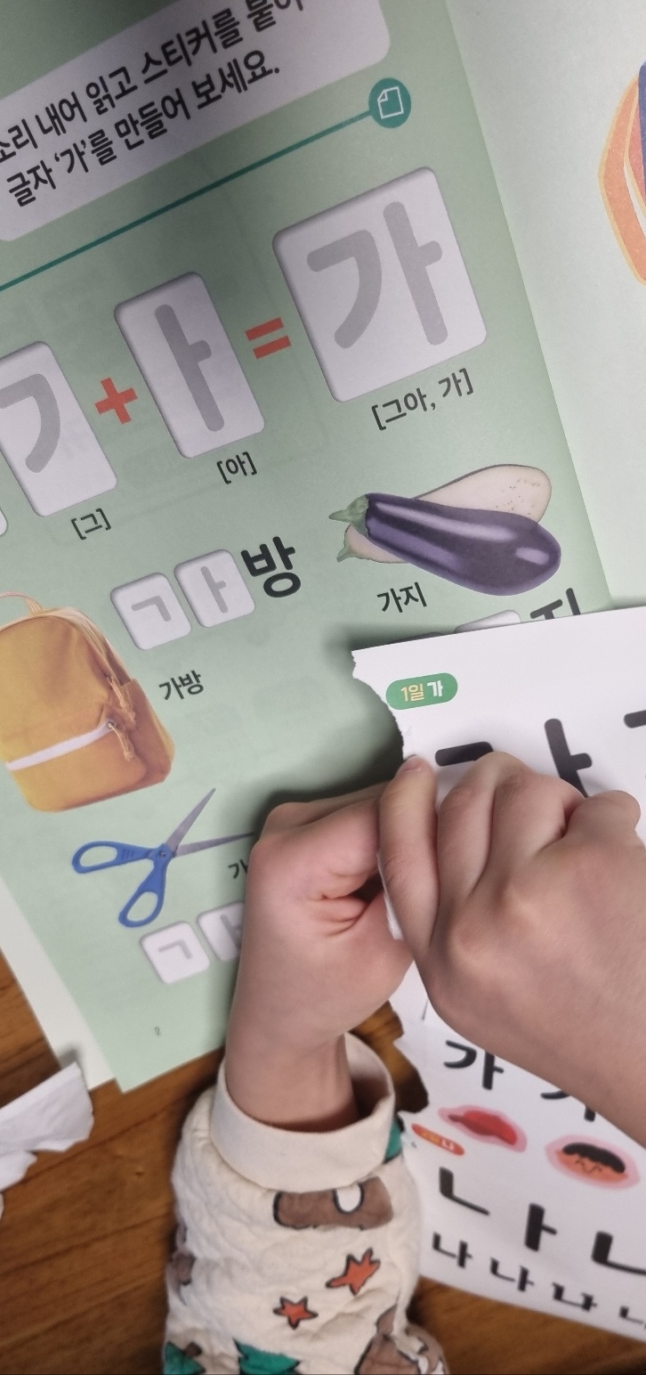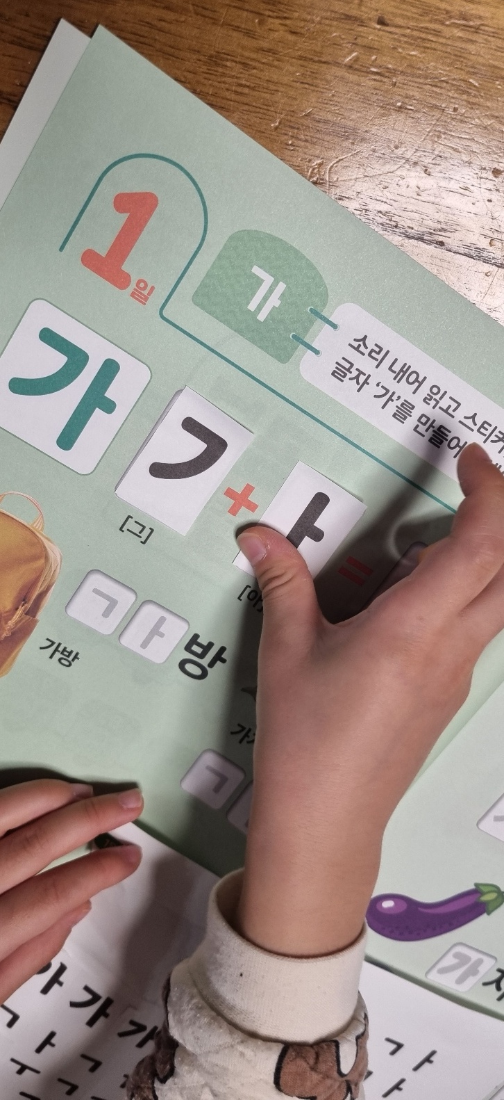 25년 올 해 학교 들어가는 우리 아이.아직 한글을 긴가민가해서 복습 겸 준비한 교재.4세 첫 공부용으로도 좋고, 한글 쓰면서 연습하기 싫어하는 아이를 위해전면 스티커 붙이는 교재를 찾았다.하루에 한 자음씩 4쪽씩 할 수 있게 되어있고오늘 분량을 마치면 "참 잘했어요"란에 직접 색칠을 한다.끝까지 마치면 나에게 주는 상장과 함께 다음 책으로 넘어갈 수 있다.나는 개인적으로 아이들에게 교재 한 권을 끝내면 다이소에 가서 장난감을 하나씩 고르게 해준다.상장과 함께 받는 장난감이 재미가 쏠쏠하다. 하루 분량에 각 자음 하나씩이고 모음은 'ㅏ,ㅓ,ㅗ,ㅜ,ㅡ,ㅣ'를 매일 반복하게 해서익히는 방식이다.ㄱ의 [그] 발음과 ㅏ의 [아] 발음을 합쳐서 [가] 소리가 난다는 원리를 배우고바로 각 낱말에 들어가는 스티커를 붙인다.'ㅓ~ㅣ' 모음과 관련된 단어는 여러가지 게임처럼 되어 있어아이가 재미있게 복습하고 공부할 수 있다. 부담없이 차근차근 읽어가면서 한글놀이 할 수 있어 다 좋은데단 한가지 단점은... 스티커가 코팅지가 아니라 순수 종이라서스티커 페이지를 뜯을 때도, 스티커를 뜯을 때도 잘 찢어진다. ㅠㅠ아이가 직접 스티커를 떼서 하는 게 가장 좋지만연령이 어리다면 엄마가 뜯어주고 아이가 붙이게 하는 것도 좋을 듯 하다.8살은 정교하게 소근육 발달도 시킬 겸조금 찢어지더라도 직접 떼고 붙이기! 유치원 마지막 겨울방학에, 학교 들어가기 직전,아이와 한글 복습을 즐겁게 하기 위해14일 완성 한글 스티커!즐겁게 놀면서 공부하자~출판사로부터 도서 협찬을 받고 본인의 주관적 견해에 의해 작성하였습니다