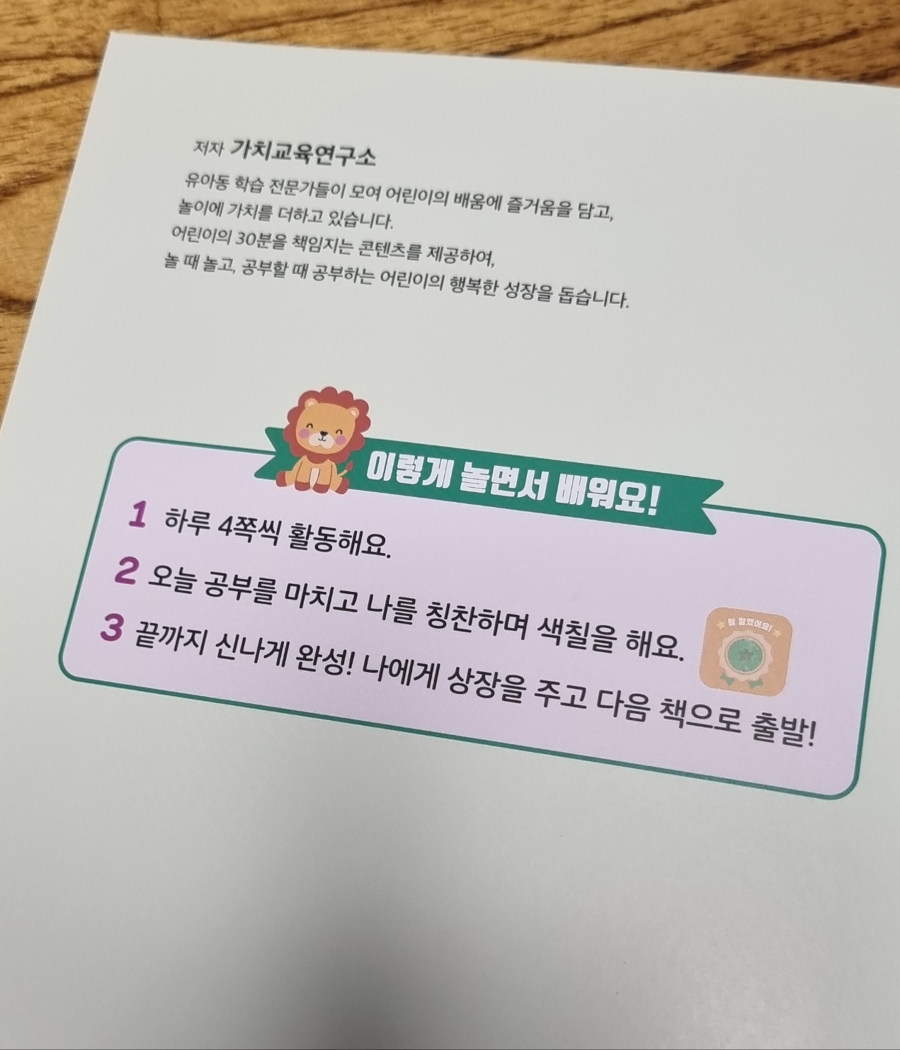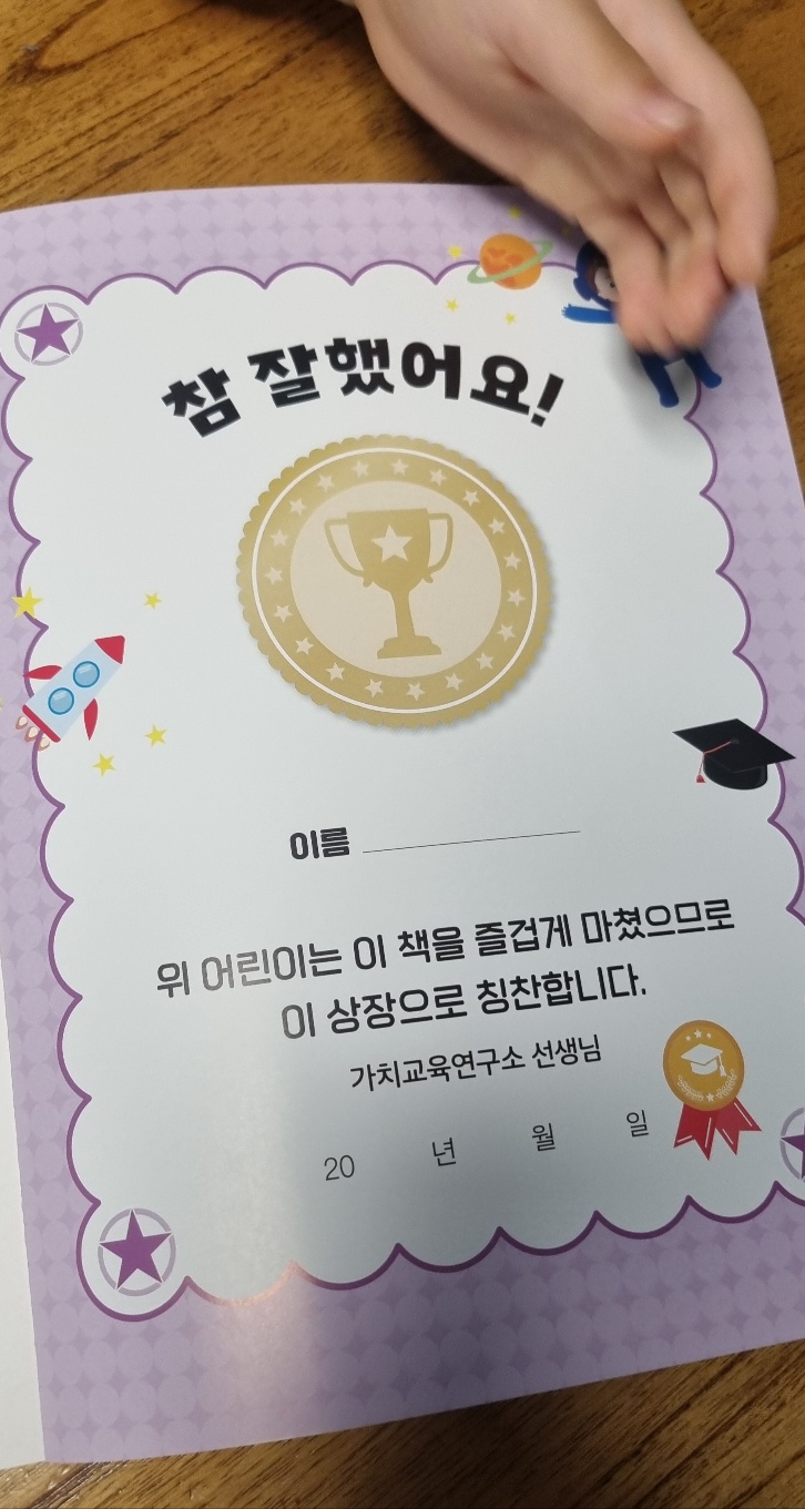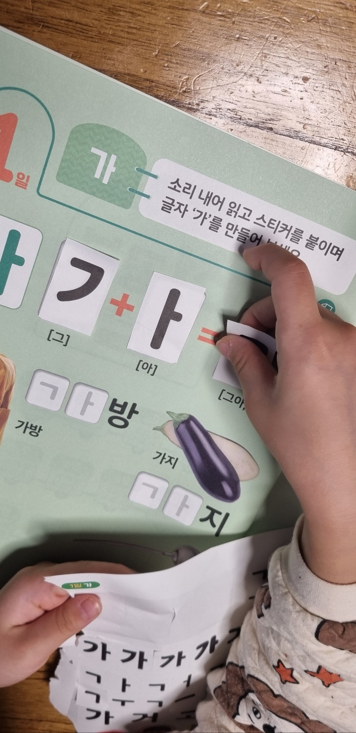 25년 올 해 학교 들어가는 우리 아이.아직 한글을 긴가민가해서 복습 겸 준비한 교재.4세 첫 공부용으로도 좋고, 한글 쓰면서 연습하기 싫어하는 아이를 위해전면 스티커 붙이는 교재를 찾았다.하루에 한 자음씩 4쪽씩 할 수 있게 되어있고오늘 분량을 마치면 "참 잘했어요"란에 직접 색칠을 한다.끝까지 마치면 나에게 주는 상장과 함께 다음 책으로 넘어갈 수 있다.나는 개인적으로 아이들에게 교재 한 권을 끝내면 다이소에 가서 장난감을 하나씩 고르게 해준다.상장과 함께 받는 장난감이 재미가 쏠쏠하다. 하루 분량에 각 자음 하나씩이고 모음은 'ㅏ,ㅓ,ㅗ,ㅜ,ㅡ,ㅣ'를 매일 반복하게 해서익히는 방식이다.ㄱ의 [그] 발음과 ㅏ의 [아] 발음을 합쳐서 [가] 소리가 난다는 원리를 배우고바로 각 낱말에 들어가는 스티커를 붙인다.'ㅓ~ㅣ' 모음과 관련된 단어는 여러가지 게임처럼 되어 있어아이가 재미있게 복습하고 공부할 수 있다. 부담없이 차근차근 읽어가면서 한글놀이 할 수 있어 다 좋은데단 한가지 단점은... 스티커가 코팅지가 아니라 순수 종이라서스티커 페이지를 뜯을 때도, 스티커를 뜯을 때도 잘 찢어진다. ㅠㅠ아이가 직접 스티커를 떼서 하는 게 가장 좋지만연령이 어리다면 엄마가 뜯어주고 아이가 붙이게 하는 것도 좋을 듯 하다.8살은 정교하게 소근육 발달도 시킬 겸조금 찢어지더라도 직접 떼고 붙이기! 유치원 마지막 겨울방학에, 학교 들어가기 직전,아이와 한글 복습을 즐겁게 하기 위해14일 완성 한글 스티커!즐겁게 놀면서 공부하자~출판사로부터 도서 협찬을 받고 본인의 주관적 견해에 의해 작성하였습니다