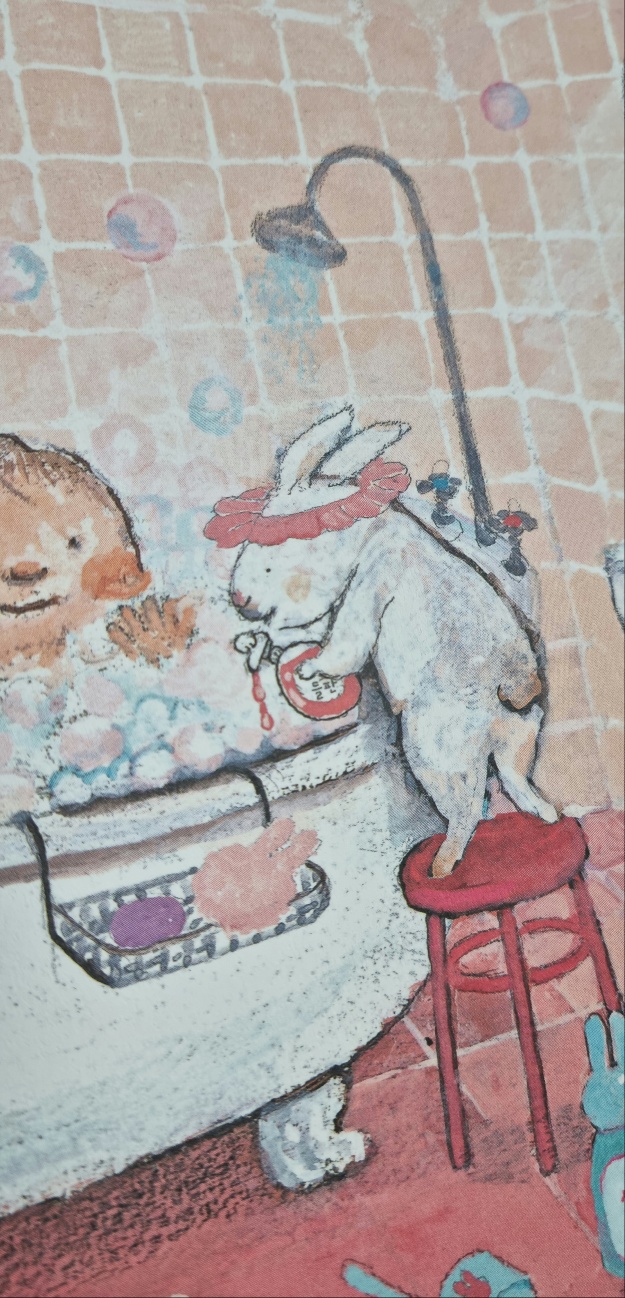 샴푸캡을 쓰고 "들판향"워시를 뿌려주는 토끼가 인상적이다.