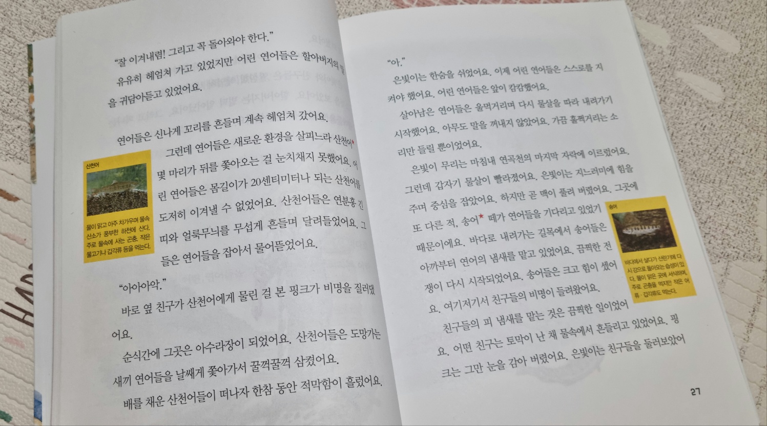 은빛이와 다른 연어들에게 그 이야기를 들어 보아요.