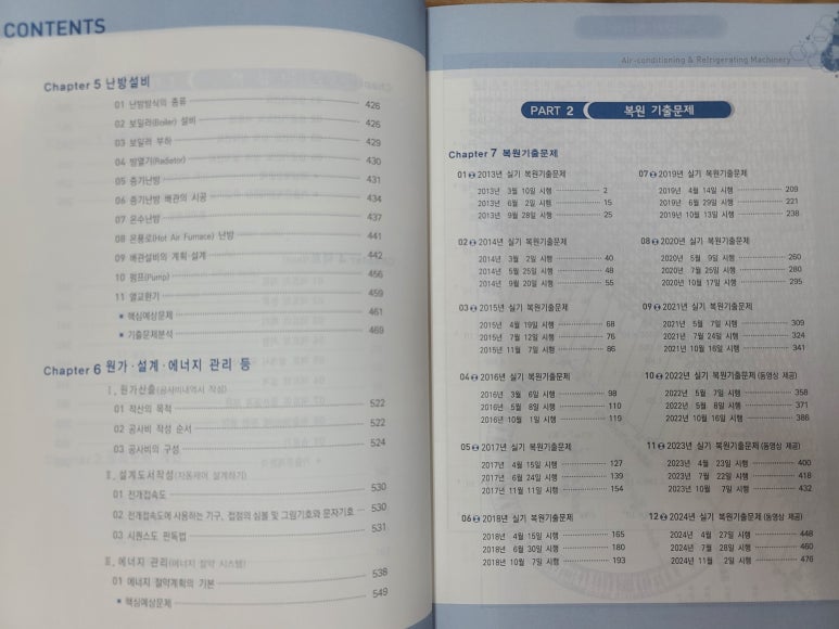 목차를 살펴보니 공조냉동기계기사 실기시험의 이론이 6개의 챕터로 구성되어 있습니다.