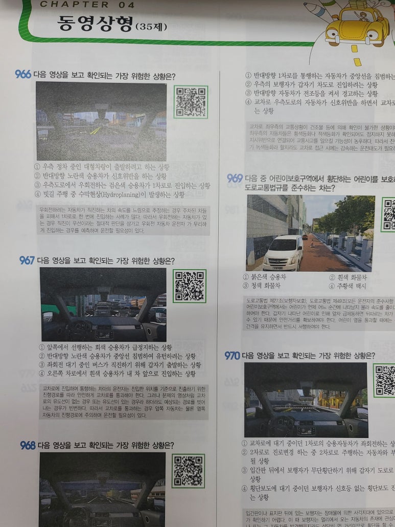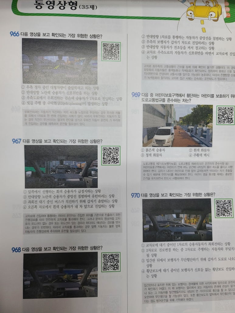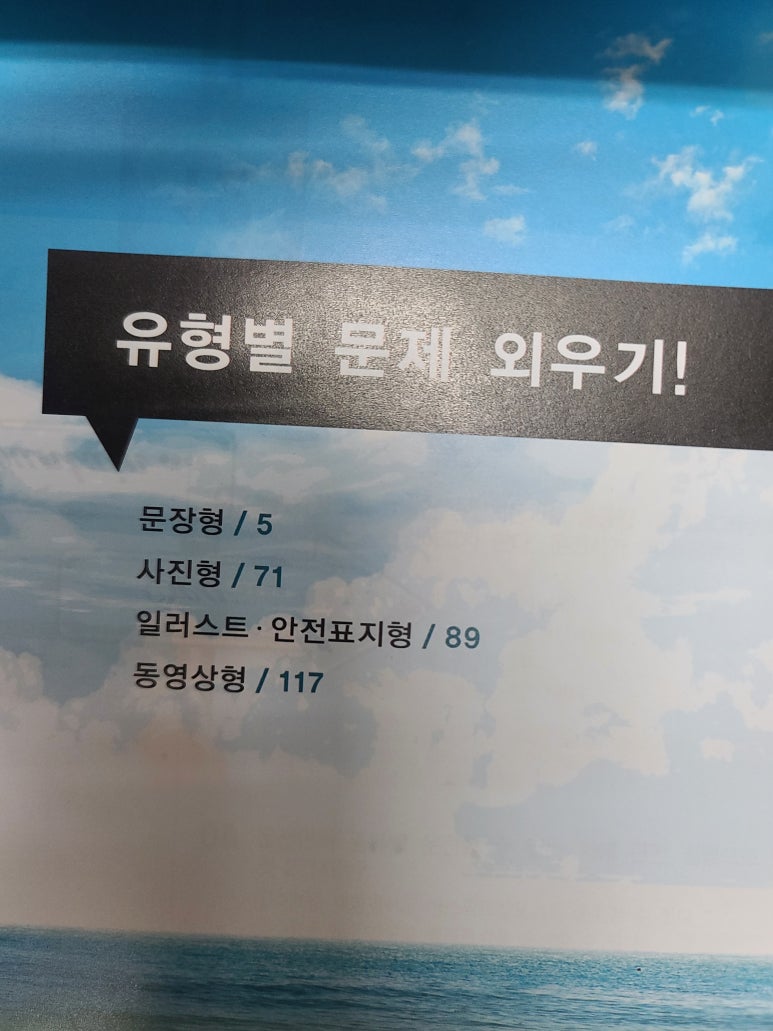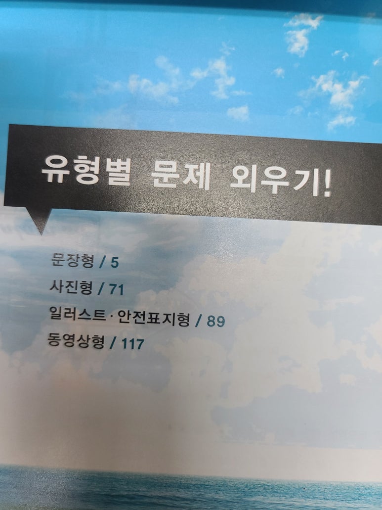목차를 살펴보니 문장형, 사진형, 일러스트안전표지형, 동영상형 문제가 총 1000문제 수록되어있습니다.