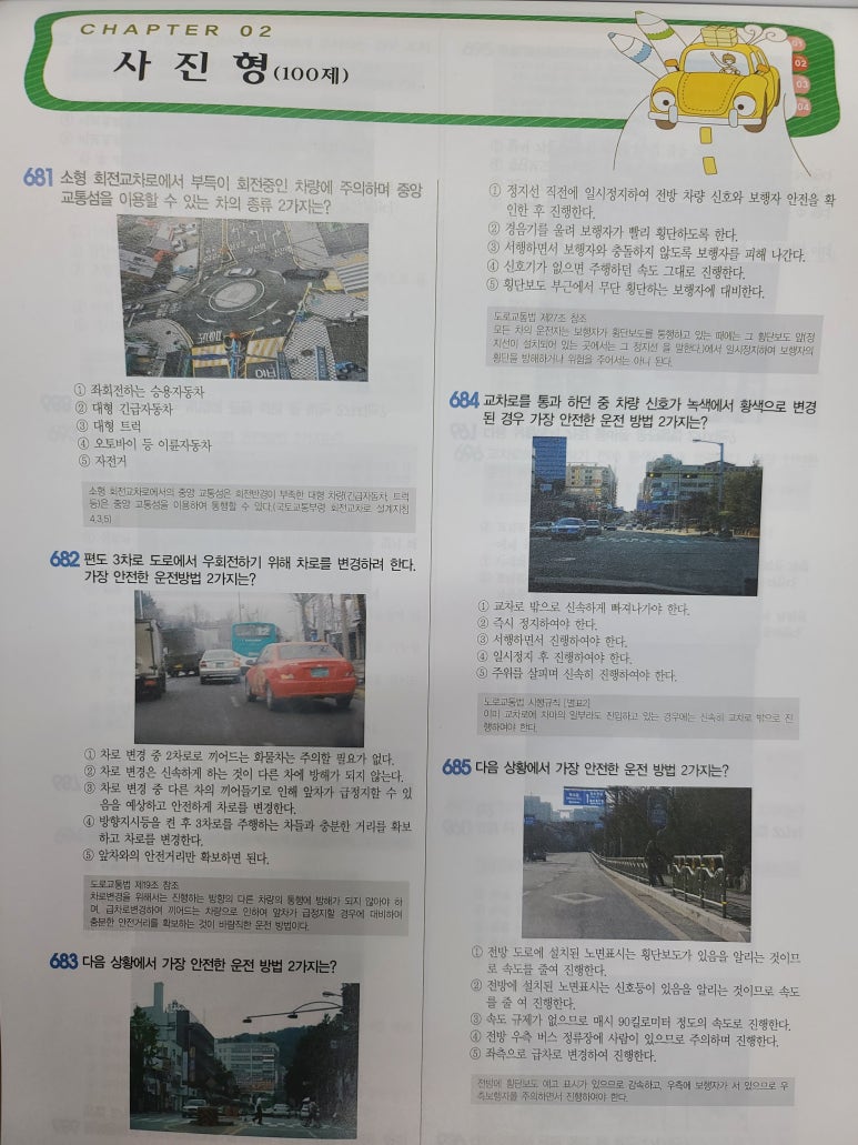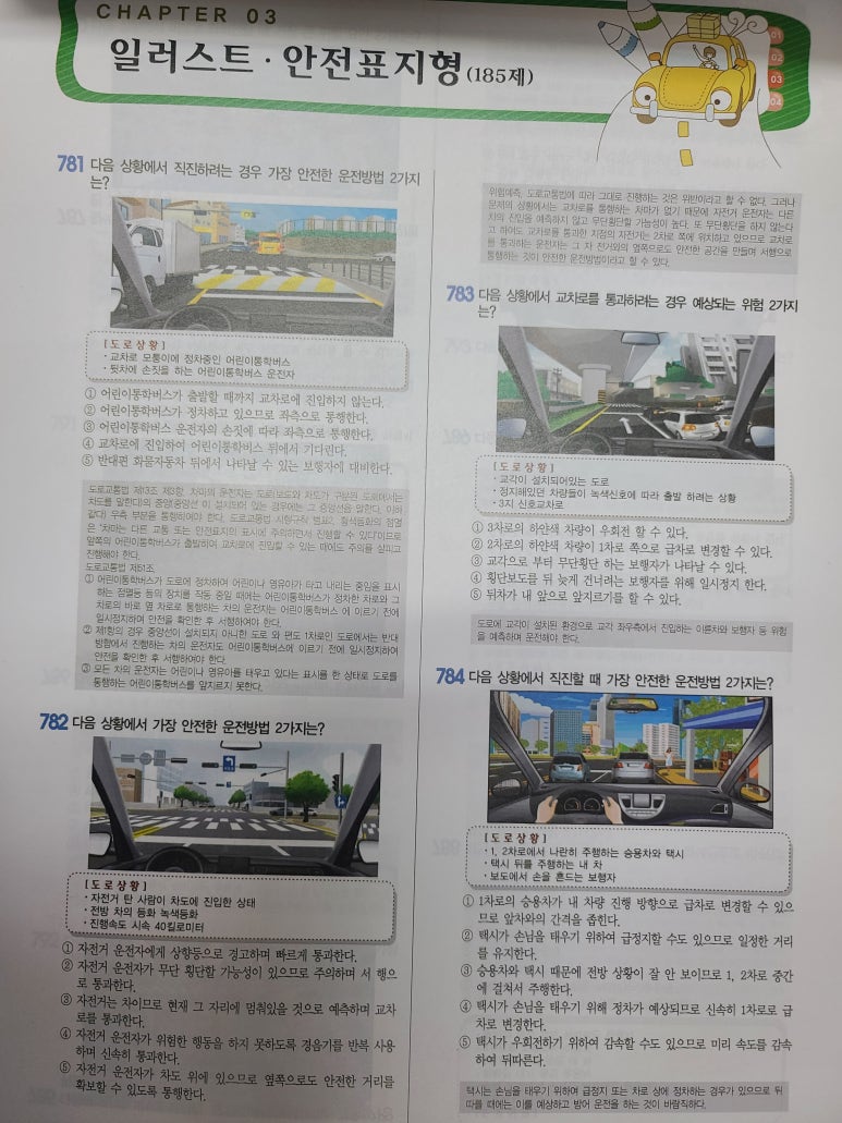 뒤쪽에는 교통안전표지와 노면표시, 신호기등에 대한 그림이 나와 있습니다.
