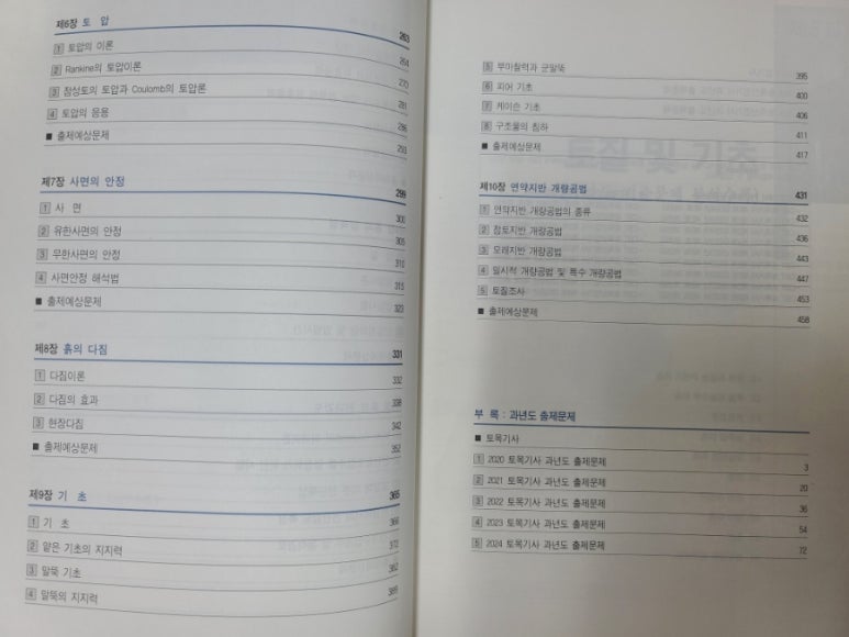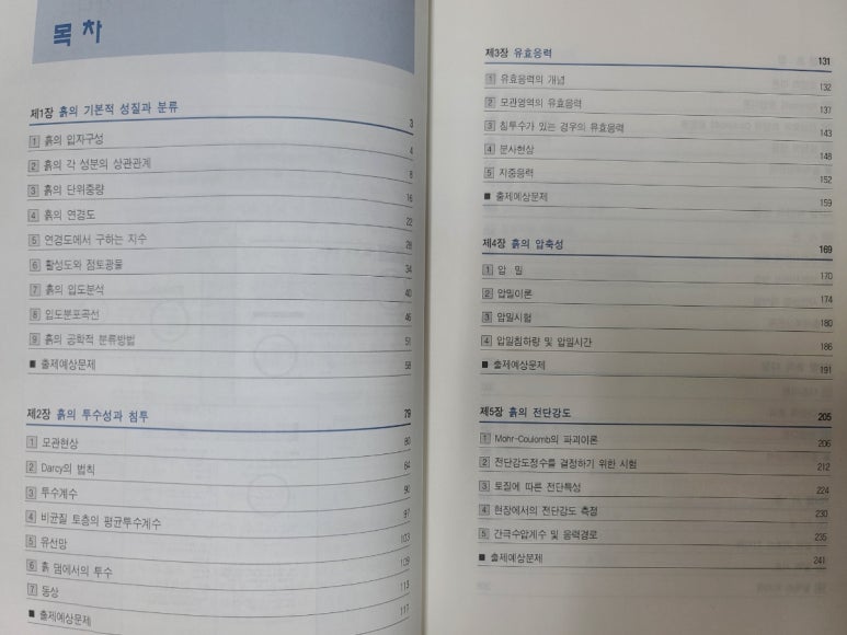 목차를 살펴보니 토질 및 기초의 챕터가 다양하게 수록되어 있습니다.