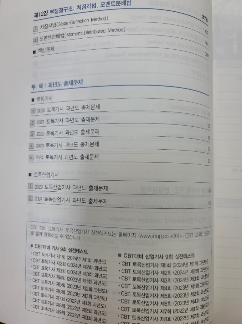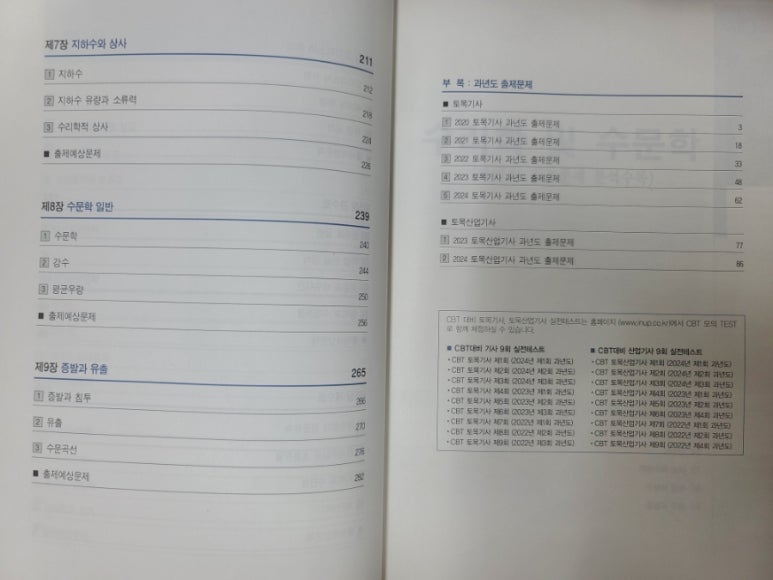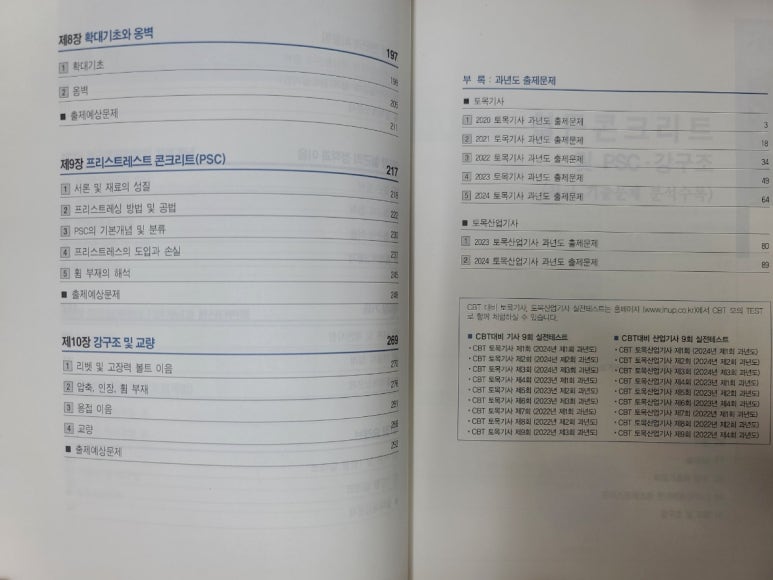 목차를 보니 필기부분과 실기부분으로 구성되어 있습니다.필기시험에 대한 여러 챕터로 구성되어 있고 각각의 챕터는 필기 핵심정리와 과년도 예상문제도 수록되어 있습니다. 그리고 과년도 기출문제도 수록되어 있습니다. CBT실전테스트도 해 볼 수 있습니다.
