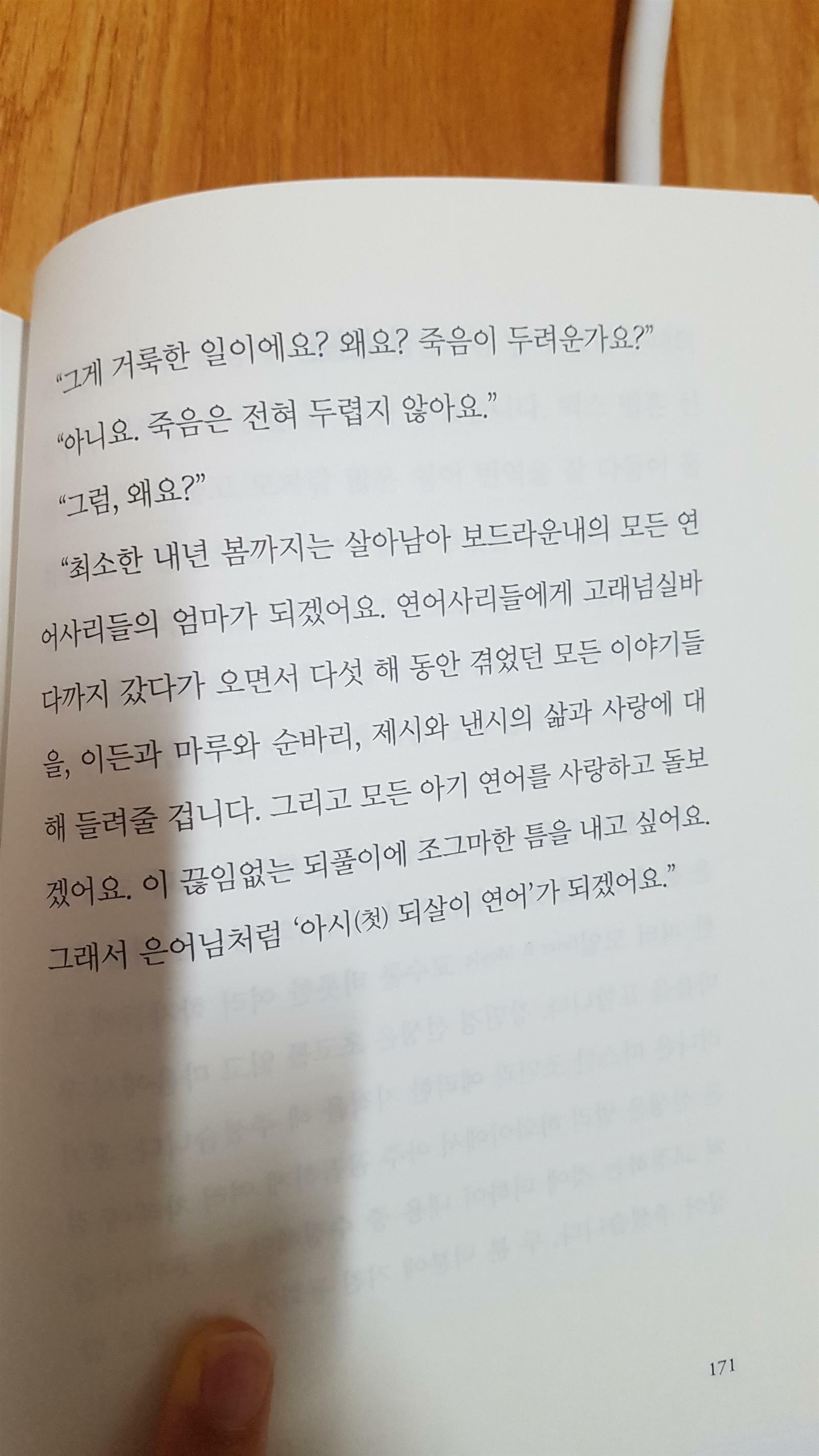 저자가 동물들을 돌보며 삶의 활력을 찾는 모습도 보이고 사랑하며 봉사하는 삶가운데 더 커다란 비젼을 갖고 동물 호스피스를 설립하는 모습은 정말 나누는 삶에 힘이 있다는 생각이 들었다. 동물호스피스를 하는 가운데 많은 동물들을 하늘로 보내며 느껴지는 감정이 나에게 와닿아 눈물이 나기도 하고 마음이 찡하기도 하였다.