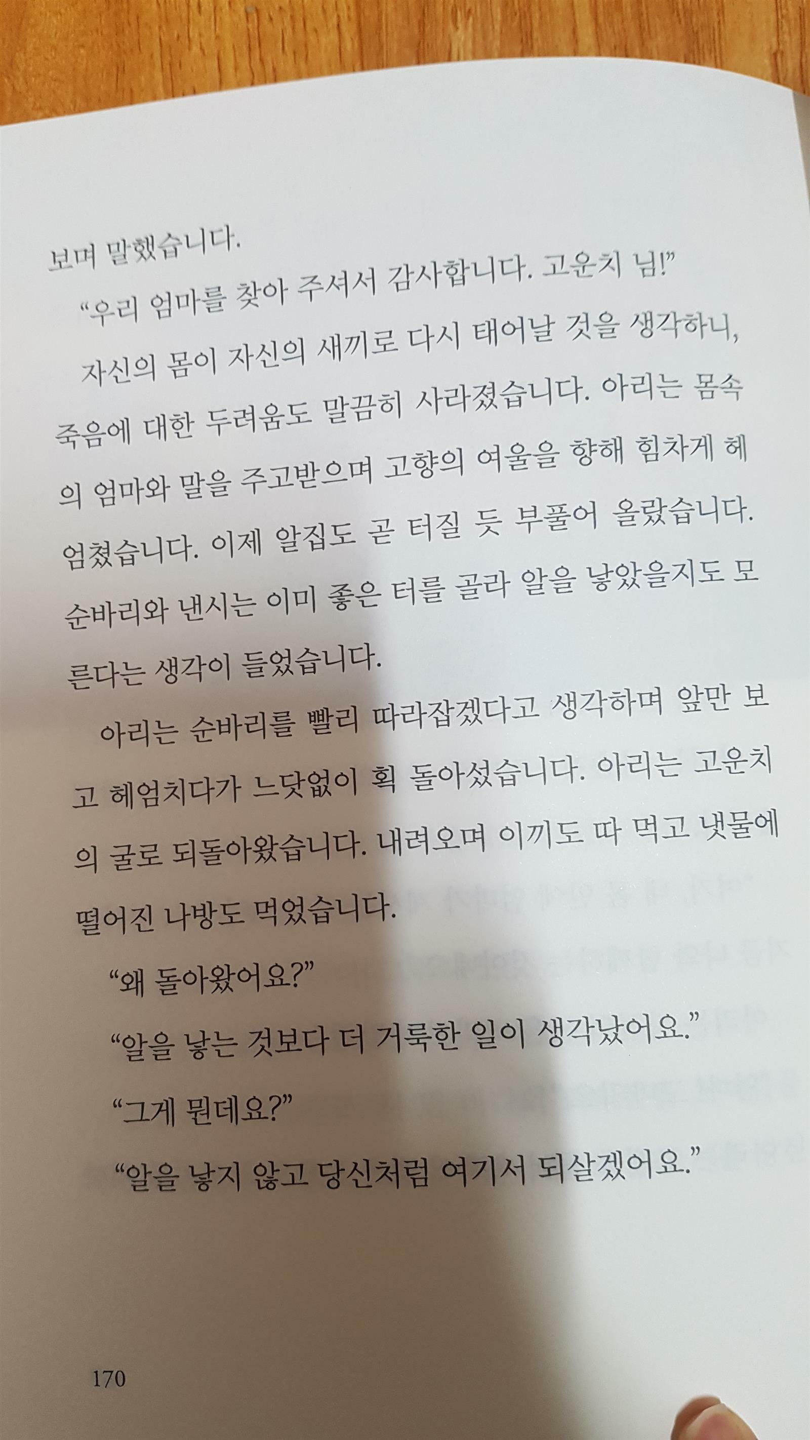 지금 나도 내 삶 가운데 고민과 염려 두려움과 불안이 있다. 그런데 이 소설을 통해 정말 마음에 힘을 얻고 다시 삶의 희망을 갖게 된다. 이 소설속에 나오는 사람들의 삶이 나에게 선한 자극을 준다. 나에게 매일매일 일어나는 마음의 전쟁속에 정말 작은 것에 감사하며 하나님을 의지하고 싶은 생각이 든다.