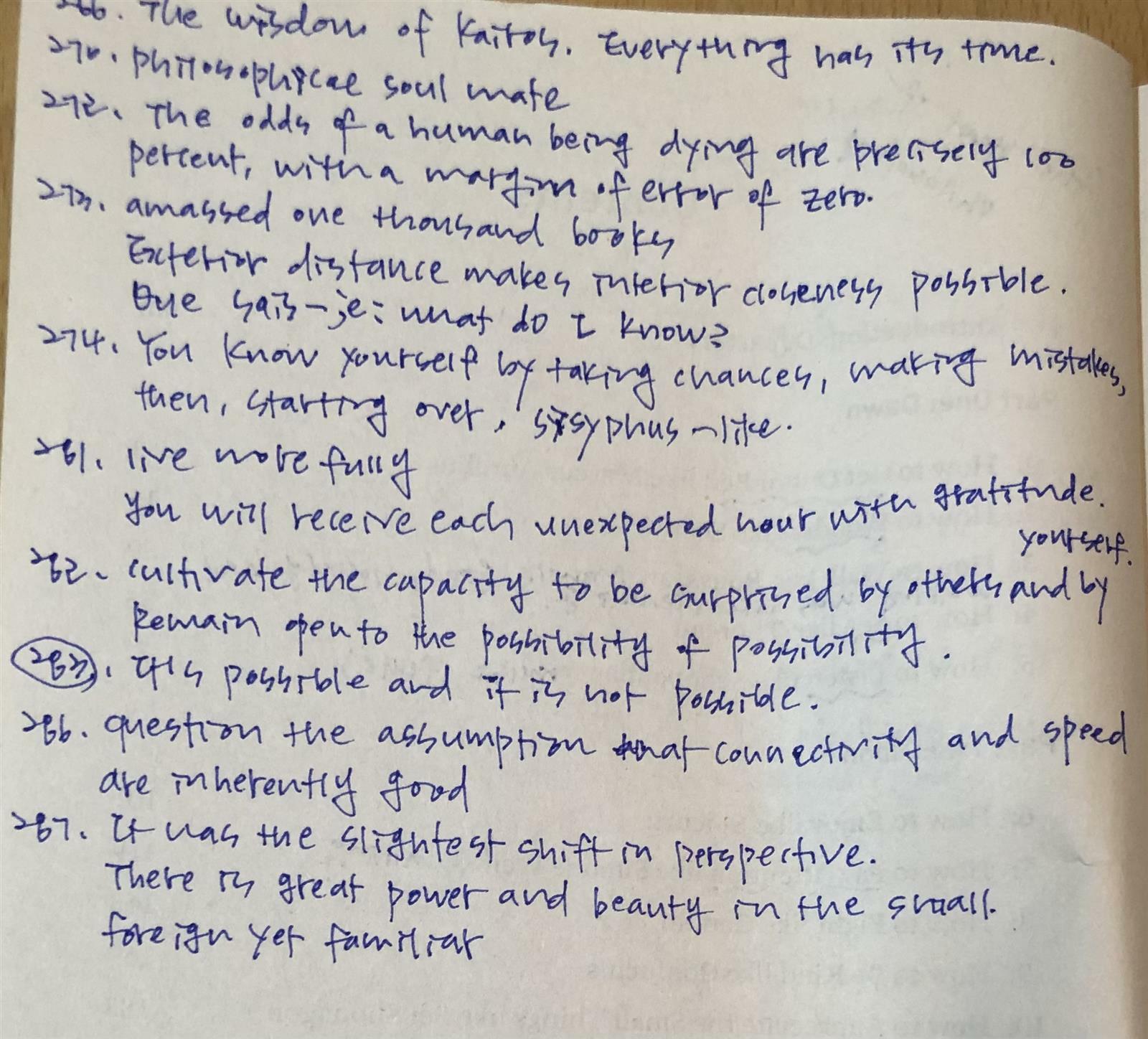 그간 잘 알지 못하던 철학자도 몇 명 있어서 그들의 삶을 짧게나마 바라보며 지혜를 건질 수 있어 행복한 시간이었다. 14명의 철학자들에게서 건진 명언(Quotes)은 더 없이 값진 선물이며, 내가 예전에 몽테뉴에게서 배운 것 처럼 현재는 이 책 앞 페이지 여백에 썼으나 언젠가 나의 집 어딘가에 적어서 걸어 두며, 작가처럼 우울한 감정(melancholy)이 찾아들 때, 치료약으로 사용하리라. 몽테뉴 생가를 다녀온 후 Sonya가 쓴 문장도 내게 많은 생각을 하게 한다. ‘It is possible and it is not possible.’