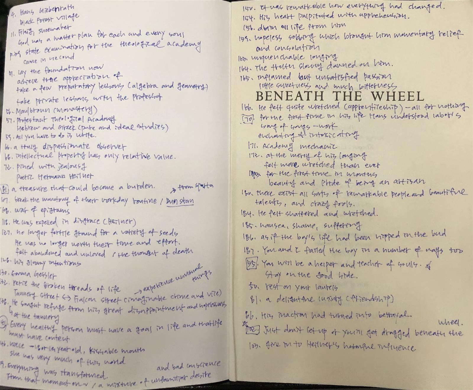 모든 건강한 사람은 삶의 목적이 있어야 한다(Every healthy person must have a goal in life.)라는 문장이 있었다. 그 목적을 찾지 못해서 주인공 Hans는 어린 나이에 죽음을 맞이하게 된 것일까? 영혼을 살리는 조력자이자 스승이 될것이다(You will be a helper and teacher of souls.)라는 구두 수선공의 따뜻한 메세지가 오히려 불편하고 당황스럽게 들렸던 학교에서의 모범생은 결국 사회에서 부적응자가 되었다.