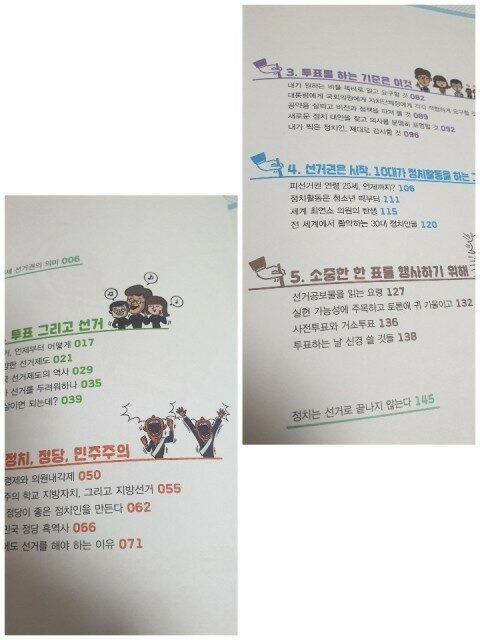 우리나라 정당의 역사와 전 세계에서 최초로 실시된 선거는 무엇인지 알아보고 선거구제와 대표제, 우리나라 선거제도가 어떻게 달라졌는지등 정치 선거와 관련된 의미와 특징에 대해 알 수 있고 어려운 용어들의 의미도 자연스럽게 이해할 수 있습니다. 알면 더 커보이는 선거 좀 더 깊이있는 선거 이야기를 만나볼 수 있고 개념도 짚어볼 수 있도록 정리가 되어있고 우리나라 정치사의 흐름을 한눈에 살펴보며 선거와 정치관련 문제에 대해 관심을 가질 수 있는 시간이 되었던것 같아 의미있는 시간이었습니다.