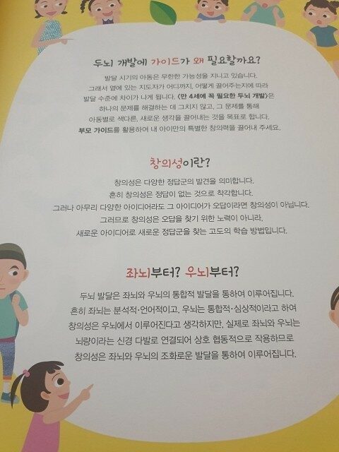 아이들은 재미있게 놀면서 자연스럽게 많은 것을 배우고 깨칩니다. 놀이는 아이에게 흥미와 재미를 느끼게 할 뿐만 아니라 그 과정에서 기본 지식을 몸소 체험하게 하지요. 『만 4세에 꼭 필요한 두뇌개발』은 유아가 놀이하듯이 즐겁게 시작할 수 있는 창의적인 학습 프로그램이에요. 유아의 연령별 발달 수준에 맞춰 [수학], [수와 셈], [IQ 두뇌 개발], [CQ 그리기], [EQ 놀이 미술]등의 영역을다루어 주며, 유아가 좋아하는 스티커 붙이기, 색칠하기, 선 긋기, 그리기 같은 다양한 활동거리가 가득 담겨 있어서 억지로 가르쳐 주지 않아도 스스로 쉽게 공부하고 깨칠 수 있지요. 놀이처럼 재미있게 공부하면서 기초를 탄탄하게 쌓아 주는 『만 4세에 꼭 필요한 두뇌개발』과 함께 유아의 기초 학습 능력을 다지고 창의력과 사고력을 쑥쑥 키워 줄수있어요.